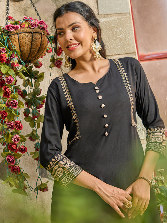 MRP (Inclusive of all taxes)Regular price ₹ 1,199.00₹ 1,199.00 Regular priceUnit price / per₹ 2,699.00Sale priceS M L XL 2XL 3XL 4XL 5XL 6XL add to cartSale{"id":6870441197654,"title":"Solid Zari \u0026 Sequins Embroidered Buttoned Kurta with Pant - Black","handle":"solid-zari-sequins-embroidered-buttoned-kurta-with-pant-black","description":"\u003ch1\u003eHighlights\u003c\/h1\u003e\n- Solid Straight Cut Kurta\u003cbr data-mce-fragment=\"1\"\u003e- Ethnic Buttons on the Centre Front Yoke\u003cbr data-mce-fragment=\"1\"\u003e- Zari \u0026amp; Sequins Embroidered Sleeves \u0026amp; Front Upper Layer\u003cbr data-mce-fragment=\"1\"\u003e- Paired with Solid Pants\u003cbr data-mce-fragment=\"1\"\u003e- Zari \u0026amp; Sequins Embroidered Hemline\u003cbr data-mce-fragment=\"1\"\u003e\u003cbr data-mce-fragment=\"1\"\u003e\n\u003ch1\u003eFabric \u0026amp; Colour\u003c\/h1\u003e\nTop Colour: Black\u003cbr data-mce-fragment=\"1\"\u003eTop Fabric: Viscose Rayon\u003cbr data-mce-fragment=\"1\"\u003eBottom Colour: Black\u003cbr data-mce-fragment=\"1\"\u003eBottom Fabric: Viscose Rayon\u003cbr data-mce-fragment=\"1\"\u003e\n\u003ch1\u003eSpecifications\u003c\/h1\u003e\nTop Design: Solid\u003cbr data-mce-fragment=\"1\"\u003eTop Craft: Embroidery, Plain and Prints\u003cbr data-mce-fragment=\"1\"\u003eTop Shape: Straight\u003cbr data-mce-fragment=\"1\"\u003eNeck: Round Neck\u003cbr data-mce-fragment=\"1\"\u003eSleeve Length: Three-Quarter Sleeves\u003cbr data-mce-fragment=\"1\"\u003eTop Length: Knee Length\u003cbr data-mce-fragment=\"1\"\u003eHemline: Straight\u003cbr data-mce-fragment=\"1\"\u003eSlit: Side Slits\u003cbr data-mce-fragment=\"1\"\u003e\u003cbr data-mce-fragment=\"1\"\u003eBottom Type: Trousers\u003cbr data-mce-fragment=\"1\"\u003eBottom Closure: Slip-On\u003cbr data-mce-fragment=\"1\"\u003eWaistband: Elasticated\u003cbr data-mce-fragment=\"1\"\u003e\u003cbr data-mce-fragment=\"1\"\u003eWash Care: Dry Clean\u003cbr data-mce-fragment=\"1\"\u003e\u003cbr data-mce-fragment=\"1\"\u003eMeasurement (in inches)\u003cbr data-mce-fragment=\"1\"\u003eLength – 44, Sleeves – 17,\u003cbr data-mce-fragment=\"1\"\u003eBottom - 38\u003cbr data-mce-fragment=\"1\"\u003e\u003cbr data-mce-fragment=\"1\"\u003eModel’s Height: 5’7”. Wearing Size S.\u003cbr data-mce-fragment=\"1\"\u003e\n\u003ch1\u003eProduct Information\u003c\/h1\u003e\nManufactured\/Packed\/Marketed By:\u003cbr data-mce-fragment=\"1\"\u003eFashor Lifestyle Pvt. Ltd.\u003cbr data-mce-fragment=\"1\"\u003e28\/30, Sudarshanpura Industrial Area,\u003cbr data-mce-fragment=\"1\"\u003eJaipur - 302006.\u003cbr data-mce-fragment=\"1\"\u003eCountry of Origin: India","published_at":"2023-09-18T10:11:16+05:30","created_at":"2023-07-08T12:09:51+05:30","vendor":"Fashor","type":"2P Kurta Set","tags":["1001-2000","16503","2XL","All Styles","bogo-zone","bs","casualwear","colour_black","embroidery","fabric_rayon","ks","KURTI","kurtis","MAVERICK","meta-size-chart-","monsoo","plain-and-prints","S","Sets under 2999","solid","straight","viscose-rayon","XL"],"price":119900,"price_min":119900,"price_max":119900,"available":true,"price_varies":false,"compare_at_price":269900,"compare_at_price_min":269900,"compare_at_price_max":269900,"compare_at_price_varies":false,"variants":[{"id":40290703212630,"title":"S","option1":"S","option2":null,"option3":null,"sku":"36-KBA16503E3FS","requires_shipping":true,"taxable":false,"featured_image":{"id":31609133793366,"product_id":6870441197654,"position":1,"created_at":"2023-09-26T15:46:07+05:30","updated_at":"2023-09-26T15:46:09+05:30","alt":null,"width":1080,"height":1440,"src":"\/\/fashor.com\/cdn\/shop\/files\/22768_1.jpg?v=1695723369","variant_ids":[40256344522838,40256344555606,40256344588374,40256344621142,40256344653910,40290703212630,40302652293206,40302652325974,40302652358742]},"available":true,"name":"Solid Zari \u0026 Sequins Embroidered Buttoned Kurta with Pant - Black - S","public_title":"S","options":["S"],"price":119900,"weight":0,"compare_at_price":269900,"inventory_quantity":2,"inventory_management":"shopify","inventory_policy":"deny","barcode":null,"featured_media":{"alt":null,"id":24323168239702,"position":1,"preview_image":{"aspect_ratio":0.75,"height":1440,"width":1080,"src":"\/\/fashor.com\/cdn\/shop\/files\/22768_1.jpg?v=1695723369"}},"requires_selling_plan":false,"selling_plan_allocations":[],"quantity_rule":{"min":1,"max":null,"increment":1}},{"id":40256344522838,"title":"M","option1":"M","option2":null,"option3":null,"sku":"38-KBA16503E3FS","requires_shipping":true,"taxable":false,"featured_image":{"id":31609133793366,"product_id":6870441197654,"position":1,"created_at":"2023-09-26T15:46:07+05:30","updated_at":"2023-09-26T15:46:09+05:30","alt":null,"width":1080,"height":1440,"src":"\/\/fashor.com\/cdn\/shop\/files\/22768_1.jpg?v=1695723369","variant_ids":[40256344522838,40256344555606,40256344588374,40256344621142,40256344653910,40290703212630,40302652293206,40302652325974,40302652358742]},"available":false,"name":"Solid Zari \u0026 Sequins Embroidered Buttoned Kurta with Pant - Black - M","public_title":"M","options":["M"],"price":119900,"weight":0,"compare_at_price":269900,"inventory_quantity":0,"inventory_management":"shopify","inventory_policy":"deny","barcode":null,"featured_media":{"alt":null,"id":24323168239702,"position":1,"preview_image":{"aspect_ratio":0.75,"height":1440,"width":1080,"src":"\/\/fashor.com\/cdn\/shop\/files\/22768_1.jpg?v=1695723369"}},"requires_selling_plan":false,"selling_plan_allocations":[],"quantity_rule":{"min":1,"max":null,"increment":1}},{"id":40256344555606,"title":"L","option1":"L","option2":null,"option3":null,"sku":"40-KBA16503E3FS","requires_shipping":true,"taxable":false,"featured_image":{"id":31609133793366,"product_id":6870441197654,"position":1,"created_at":"2023-09-26T15:46:07+05:30","updated_at":"2023-09-26T15:46:09+05:30","alt":null,"width":1080,"height":1440,"src":"\/\/fashor.com\/cdn\/shop\/files\/22768_1.jpg?v=1695723369","variant_ids":[402563