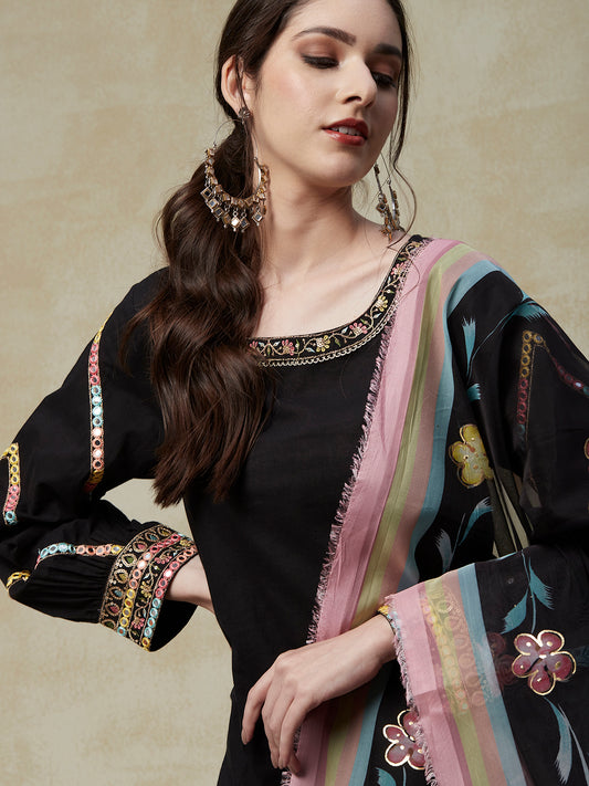 MRP (Inclusive of all taxes)Regular price ₹ 2,499.00₹ 2,499.00 Regular priceUnit price / per₹ 5,599.00Sale priceS M L XL 2XL 3XL 4XL 5XL 6XL add to cartSale{"id":6866462998614,"title":"Solid Mirror, Resham \u0026 Zari Embroidered Kurta With Salwar Pants \u0026 Hand Painted Dupatta - Black","handle":"solid-mirror-resham-zari-embroidered-kurta-with-salwar-pants-hand-painted-dupatta-black","description":"\u003ch1\u003eHighlights\u003c\/h1\u003e\n- Solid Straight Cut Kurta\u003cbr\u003e- Resham, Sequins \u0026amp; Zari Embroidered Neckline\u003cbr\u003e- Mirror, Resham \u0026amp; Zari Embroidered Border on the Sleeves\u003cbr\u003e- Mirror, Resham, Sequins \u0026amp; Zari Embroidered Buti on the Front Panel\u003cbr\u003e- Paired with Salwar Pants\u003cbr\u003e- Mirror, Resham \u0026amp; Zari Embroidered Border on the Hemline\u003cbr\u003e- Styled with Hand Painted Floral Dupatta\u003cbr\u003e- Foil Printed all over\u003cbr\u003e- Striped Border on the Sides\u003cbr\u003e\u003cbr\u003e\n\u003ch1\u003eFabric \u0026amp; Colour\u003c\/h1\u003e\nTop Colour: Black\u003cbr\u003eTop Fabric: Cotton\u003cbr\u003eBottom Colour: Black\u003cbr\u003eBottom Fabric: Pure Cotton\u003cbr\u003eDupatta Colour: Black\u003cbr\u003eDupatta Fabric: Organza\u003cbr\u003e\n\u003ch1\u003eSpecifications\u003c\/h1\u003e\nTop Design: Solid\u003cbr\u003eTop Craft: Mirror work, Sequins, Embroidery\u003cbr\u003eTop Shape: Straight\u003cbr\u003eNeck: Scoop Neck\u003cbr\u003eSleeve Length: Three-Quarter Sleeves\u003cbr\u003eTop Length: Calf Length\u003cbr\u003eHemline: Straight\u003cbr\u003eSlit: Side Slits\u003cbr\u003e\u003cbr\u003eBottom Type: Salwar\u003cbr\u003eBottom Closure: Slip-On\u003cbr\u003eWaistband: Partially Elasticated\u003cbr\u003e\u003cbr\u003eDupatta Pattern: Printed\u003cbr\u003eDupatta Border: Printed\u003cbr\u003e\u003cbr\u003eWash Care: Dry Clean\u003cbr\u003e\u003cbr\u003eMeasurement (in inches)\u003cbr\u003eLength – 45, Sleeves – 22,\u003cbr\u003eBottom – 34\u003cbr\u003e\u003cbr\u003eModel’s Height: 5’7”. Wearing Size S.\u003cbr\u003e\n\u003ch1\u003eProduct Information\u003c\/h1\u003e\nManufactured\/Packed\/Marketed By:\u003cbr\u003eFashor Lifestyle Pvt. Ltd.\u003cbr\u003e28\/30, Sudarshanpura Industrial Area,\u003cbr\u003eJaipur - 302006.\u003cbr\u003eCountry of Origin: India","published_at":"2023-06-07T16:07:29+05:30","created_at":"2023-06-06T15:20:30+05:30","vendor":"Fashor","type":"3P Kurta Set","tags":["13417","2001-3000","2XL","All Styles","bogo-zone","bs","casualwear","colour_black","cotton","embroidery","ks","KURTI","kurtis","L","meta-size-chart-","mirror-work","monsoo","occasionwear","plusbogo","sequins","Sets under 2999","solid","straight"],"price":249900,"price_min":249900,"price_max":249900,"available":true,"price_varies":false,"compare_at_price":559900,"compare_at_price_min":559900,"compare_at_price_max":559900,"compare_at_price_varies":false,"variants":[{"id":40245016625238,"title":"S","option1":"S","option2":null,"option3":null,"sku":"36-STA13417K2FS","requires_shipping":true,"taxable":false,"featured_image":{"id":31498597531734,"product_id":6866462998614,"position":3,"created_at":"2023-06-06T16:28:17+05:30","updated_at":"2023-06-06T16:28:18+05:30","alt":null,"width":1080,"height":1440,"src":"\/\/fashor.com\/cdn\/shop\/files\/3_13373679-b832-4237-b0f7-843a5852a52f.jpg?v=1686049098","variant_ids":[40245016625238,40245016658006,40245016690774,40245016756310,40245016789078,40245016854614,40292727881814,40292727914582,40292727947350]},"available":false,"name":"Solid Mirror, Resham \u0026 Zari Embroidered Kurta With Salwar Pants \u0026 Hand Painted Dupatta - Black - S","public_title":"S","options":["S"],"price":249900,"weight":0,"compare_at_price":559900,"inventory_quantity":0,"inventory_management":"shopify","inventory_policy":"deny","barcode":null,"featured_media":{"alt":null,"id":24194825093206,"position":3,"preview_image":{"aspect_ratio":0.75,"height":1440,"width":1080,"src":"\/\/fashor.com\/cdn\/shop\/files\/3_13373679-b832-4237-b0f7-843a5852a52f.jpg?v=1686049098"}},"requires_selling_plan":false,"selling_plan_allocations":[],"quantity_rule":{"min":1,"max":null,"increment":1}},{"id":40245016658006,"title":"M","option1":"M","option2":null,"option3":null,"sku":"38-STA13417K2FS","requires_shipping":true,"taxable":false,"featured_image":{"id":31498597531734,"product_id":6866462998614,"position":3,"created_at":"2023-06-06T16:28:17+05:30","updated_at":"2023-06-06T16:28:18+05:30","alt":null,"width":1080,"height":1440,"src":"\/\/fashor.com\/cdn\/shop\/files\/3_13373679-b832-4237-b0f7-843a5852a52f.jpg?v=1686049098","variant_ids":[40245016625238,40245016658006,40245016690774,40245016756310,40245016789078,40245016854614,40292727881814,40292727914582,40292727947350]},"available":false,"name":"Solid Mirror, Resham \u0026 Zari Embroidered Kurta With Salwar Pants \u0026 Hand Painted Dupatta - Black - M","public_title":"M","options":["M"],"price":249900,"weight":0,"compare_at_price":559900,"inventory_quantity":0,"inventory_management":"shopify","inventory_policy":"deny","barcode":null,"featured_media":{"alt":null,"id":24194825093206,"position":3,"preview_image":{"aspect_ratio":0.75,"height":1440,"width":1080,"src":"\/\/fashor.com\/cdn\/shop\/files\/3_13373679-b832-4237-b0f7-843a5852a52f.jpg?v=1686049098"}},"requires_selling_plan":false,"selling_plan_allocations":[],"quantity_rule":{"min":1,"max":null,"increment":1}},{"id":40245016690774,"title":"L","option1":"L","option2":null,"option3":null,"sku":"40-STA13417K2FS","requires_shipping":true,"taxable":false,"featured_image":{"id":31498597531734,"product_id":6866462998614,"position":3,"created_at":"2023-06-06T16:28:17+05:30","updated_at":"2023-06-06T16:28:18+05:30","alt":null,"width":1080,"height":1440,"src":"\/\/fashor.com\/cdn\/shop\/files\/3_13373679-b832-4237-b0f7-843a5852a52f.jpg?v=1686049098","variant_ids":[40245016625238,40245016658006,40245016690774,40245016756310,40245016789078,40245016854614,40292727881814,40292727914582,402927