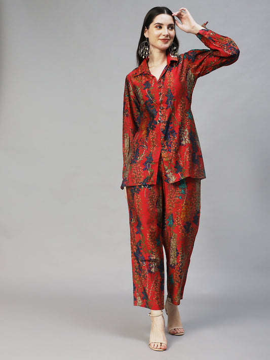 MRP (Inclusive of all taxes)Regular price ₹ 1,659.00₹ 1,659.00 Regular priceUnit price / per₹ 3,899.00Sale priceS M L XL 2XL 3XL 4XL 5XL 6XL add to cartSale{"id":6813835001942,"title":"Floral Printed Co-ord Set - Red","handle":"floral-printed-co-ord-set-red","description":"\u003cp data-mce-fragment=\"1\"\u003e\u003cspan style=\"font-weight: 400;\" data-mce-fragment=\"1\" data-mce-style=\"font-weight: 400;\"\u003e\u003c\/span\u003e\u003cspan style=\"font-weight: 400;\" data-mce-fragment=\"1\" data-mce-style=\"font-weight: 400;\"\u003eStyle: Kurta - Straight, Bottom - Pants\u003c\/span\u003e\u003c\/p\u003e\n\u003cp data-mce-fragment=\"1\"\u003e\u003cspan style=\"font-weight: 400;\" data-mce-fragment=\"1\" data-mce-style=\"font-weight: 400;\"\u003eType: Everyday Wear\/Office Wear \u003c\/span\u003e\u003c\/p\u003e\n\u003cp data-mce-fragment=\"1\"\u003e\u003cspan style=\"font-weight: 400;\" data-mce-fragment=\"1\" data-mce-style=\"font-weight: 400;\"\u003eNeckline: Collar Neckline\u003c\/span\u003e\u003c\/p\u003e\n\u003cp data-mce-fragment=\"1\"\u003e\u003cspan style=\"font-weight: 400;\" data-mce-fragment=\"1\" data-mce-style=\"font-weight: 400;\"\u003eSleeve Pattern: Cuff Sleeves\u003c\/span\u003e\u003c\/p\u003e\n\u003cp data-mce-fragment=\"1\"\u003e\u003cspan style=\"font-weight: 400;\" data-mce-fragment=\"1\" data-mce-style=\"font-weight: 400;\"\u003eSleeve Length: 3\/4th\u003c\/span\u003e\u003c\/p\u003e\n\u003cp data-mce-fragment=\"1\"\u003e\u003cspan style=\"font-weight: 400;\" data-mce-fragment=\"1\" data-mce-style=\"font-weight: 400;\"\u003eProduct Details:\u003c\/span\u003e\u003c\/p\u003e\n\u003cul data-mce-fragment=\"1\"\u003e\n\u003cli data-mce-fragment=\"1\"\u003e\u003cspan style=\"font-weight: 400;\" data-mce-fragment=\"1\" data-mce-style=\"font-weight: 400;\"\u003e Straight Fit Shirt \u003c\/span\u003e\u003c\/li\u003e\n\u003cli data-mce-fragment=\"1\"\u003e\u003cspan style=\"font-weight: 400;\" data-mce-fragment=\"1\" data-mce-style=\"font-weight: 400;\"\u003e Floral Prints all over\u003c\/span\u003e\u003c\/li\u003e\n\u003cli data-mce-fragment=\"1\"\u003e\u003cspan style=\"font-weight: 400;\" data-mce-fragment=\"1\" data-mce-style=\"font-weight: 400;\"\u003e Front Placket Detailing with \u003c\/span\u003e\u003c\/li\u003e\n\u003cli data-mce-fragment=\"1\"\u003e\u003cspan style=\"font-weight: 400;\" data-mce-fragment=\"1\" data-mce-style=\"font-weight: 400;\"\u003e Enhanced with Loops \u0026amp; Buttons Detailing\u003c\/span\u003e\u003c\/li\u003e\n\u003cli data-mce-fragment=\"1\"\u003e\u003cspan style=\"font-weight: 400;\" data-mce-fragment=\"1\" data-mce-style=\"font-weight: 400;\"\u003e Highlighted with Foil Prints \u003c\/span\u003e\u003c\/li\u003e\n\u003cli data-mce-fragment=\"1\"\u003e\u003cspan style=\"font-weight: 400;\" data-mce-fragment=\"1\" data-mce-style=\"font-weight: 400;\"\u003e Paired with Floral Printed Pants \u003c\/span\u003e\u003c\/li\u003e\n\u003cli data-mce-fragment=\"1\"\u003e\u003cspan style=\"font-weight: 400;\" data-mce-fragment=\"1\" data-mce-style=\"font-weight: 400;\"\u003e Enhanced with Foil Prints \u003c\/span\u003e\u003c\/li\u003e\n\u003cli data-mce-fragment=\"1\"\u003e\u003cspan style=\"font-weight: 400;\" data-mce-fragment=\"1\" data-mce-style=\"font-weight: 400;\"\u003e Partially Elasticated Waistline\u003c\/span\u003e\u003c\/li\u003e\n\u003cli data-mce-fragment=\"1\"\u003e\u003cspan style=\"font-weight: 400;\" data-mce-fragment=\"1\" data-mce-style=\"font-weight: 400;\"\u003e Drawstring Closure\u003c\/span\u003e\u003c\/li\u003e\n\u003c\/ul\u003e\n\u003cp data-mce-fragment=\"1\"\u003e\u003cspan style=\"font-weight: 400;\" data-mce-fragment=\"1\" data-mce-style=\"font-weight: 400;\"\u003eModel’s Height: 5’7” ft. Size: Wearing Size S \u003c\/span\u003e\u003c\/p\u003e\n\u003ch1 data-mce-fragment=\"1\"\u003e\u003cspan style=\"font-weight: 400;\" data-mce-fragment=\"1\" data-mce-style=\"font-weight: 400;\"\u003eFabric Details\u003c\/span\u003e\u003c\/h1\u003e\n\u003cp data-mce-fragment=\"1\"\u003e\u003cspan style=\"font-weight: 400;\" data-mce-fragment=\"1\" data-mce-style=\"font-weight: 400;\"\u003eFabric: Kurta - Muslin Silk, Bottom - Muslin Silk\u003c\/span\u003e\u003c\/p\u003e\n\u003cp data-mce-fragment=\"1\"\u003e\u003cspan style=\"font-weight: 400;\" data-mce-fragment=\"1\" data-mce-style=\"font-weight: 400;\"\u003eColour: Kurta - Red, Bottom - Red\u003c\/span\u003e\u003c\/p\u003e\n\u003cp data-mce-fragment=\"1\"\u003e\u003cspan style=\"font-weight: 400;\" data-mce-fragment=\"1\" data-mce-style=\"font-weight: 400;\"\u003eWash Care: Hand wash in cold water\u003c\/span\u003e\u003c\/p\u003e\n\u003ch1\u003eGarment Measurements\u003c\/h1\u003e\n\u003cp\u003e\u003cstrong\u003eMeasurement (in inches) \u003c\/strong\u003e\u003c\/p\u003e\n\u003cp\u003eLength – 29, Sleeves – 23,\u003c\/p\u003e\n\u003cp\u003eBottom - 39\u003c\/p\u003e\n\u003ch1 data-mce-fragment=\"1\"\u003e\u003cspan data-mce-fragment=\"1\"\u003eProduct Information\u003c\/span\u003e\u003c\/h1\u003e\n\u003cp data-mce-fragment=\"1\"\u003e\u003cspan data-mce-fragment=\"1\"\u003e\u003cstrong\u003eManufactured\/Packed\/Marketed By:\u003c\/strong\u003e\u003cbr\u003e\u003c\/span\u003e\u003cspan data-mce-fragment=\"1\"\u003eFashor Lifestyle Pvt. Ltd.\u003cbr\u003e28\/30, Sudershanpura Industrial Area,\u003cbr\u003eJaipur - 302006.\u003cbr\u003e\u003cstrong\u003eCountry of Origin:\u003c\/strong\u003e India\u003c\/span\u003e\u003c\/p\u003e","published_at":"2023-06-05T09:47:16+05:30","created_at":"2022-09-27T11:22:06+05:30","vendor":"Fashor","type":"","tags":["1000 - 2000","1001-2000","11849","All Styles","bogo-zone","bs","casualwear","co-ord","colour_red","fusion","ks","KURTI","kurtis","meta-size-chart-","monsoo","Products with discounts","Red","S","Sets under 2999","Silk","STRAIGHT","workwear"],"price":165900,"price_min":165900,"price_max":165900,"available":true,"price_varies":false,"compare_at_price":389900,"compare_at_price_min":389900,"compare_at_price_max":389900,"compare_at_pr