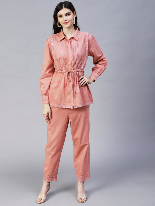 MRP (Inclusive of all taxes)Regular price ₹ 2,199.00₹ 2,199.00 Regular priceUnit price / per₹ 6,899.00Sale priceS M L XL add to cartSale{"id":6826762960982,"title":"Ethnic Embroidered Co-ords Set - Peach","handle":"ethnic-embroidered-co-ords-set-peach","description":"\u003cp data-mce-fragment=\"1\"\u003e\u003cspan style=\"font-weight: 400;\" data-mce-fragment=\"1\" data-mce-style=\"font-weight: 400;\"\u003e\u003c\/span\u003e\u003cspan style=\"font-weight: 400;\" data-mce-fragment=\"1\" data-mce-style=\"font-weight: 400;\"\u003eStyle: Kurta - Straight, Bottom - Pant\u003c\/span\u003e\u003c\/p\u003e\n\u003cp data-mce-fragment=\"1\"\u003e\u003cspan style=\"font-weight: 400;\" data-mce-fragment=\"1\" data-mce-style=\"font-weight: 400;\"\u003eType: Everyday Wear\/Office Wear \u003c\/span\u003e\u003c\/p\u003e\n\u003cp data-mce-fragment=\"1\"\u003e\u003cspan style=\"font-weight: 400;\" data-mce-fragment=\"1\" data-mce-style=\"font-weight: 400;\"\u003eNeckline: Collar Neckline \u003c\/span\u003e\u003c\/p\u003e\n\u003cp data-mce-fragment=\"1\"\u003e\u003cspan style=\"font-weight: 400;\" data-mce-fragment=\"1\" data-mce-style=\"font-weight: 400;\"\u003eSleeve Pattern: Cuff Sleeves\u003c\/span\u003e\u003c\/p\u003e\n\u003cp data-mce-fragment=\"1\"\u003e\u003cspan style=\"font-weight: 400;\" data-mce-fragment=\"1\" data-mce-style=\"font-weight: 400;\"\u003eSleeve Length: Full Sleeves\u003c\/span\u003e\u003c\/p\u003e\n\u003cp data-mce-fragment=\"1\"\u003e\u003cspan style=\"font-weight: 400;\" data-mce-fragment=\"1\" data-mce-style=\"font-weight: 400;\"\u003eProduct Details:\u003c\/span\u003e\u003c\/p\u003e\n\u003cul data-mce-fragment=\"1\"\u003e\n\u003cli data-mce-fragment=\"1\"\u003e\u003cspan style=\"font-weight: 400;\" data-mce-fragment=\"1\" data-mce-style=\"font-weight: 400;\"\u003e Straight Fit Shirt\u003c\/span\u003e\u003c\/li\u003e\n\u003cli data-mce-fragment=\"1\"\u003e\u003cspan style=\"font-weight: 400;\" data-mce-fragment=\"1\" data-mce-style=\"font-weight: 400;\"\u003e Ethnic Embroidered at Front\u003c\/span\u003e\u003c\/li\u003e\n\u003cli data-mce-fragment=\"1\"\u003e\u003cspan style=\"font-weight: 400;\" data-mce-fragment=\"1\" data-mce-style=\"font-weight: 400;\"\u003e Enhanced with Crochet Lace Detailing\u003c\/span\u003e\u003c\/li\u003e\n\u003cli data-mce-fragment=\"1\"\u003e\u003cspan style=\"font-weight: 400;\" data-mce-fragment=\"1\" data-mce-style=\"font-weight: 400;\"\u003e Front Placket Detailing with Buttons \u003c\/span\u003e\u003c\/li\u003e\n\u003cli data-mce-fragment=\"1\"\u003e\u003cspan style=\"font-weight: 400;\" data-mce-fragment=\"1\" data-mce-style=\"font-weight: 400;\"\u003e Pin Tucks Detailing at Yoke \u003c\/span\u003e\u003c\/li\u003e\n\u003cli data-mce-fragment=\"1\"\u003e\u003cspan style=\"font-weight: 400;\" data-mce-fragment=\"1\" data-mce-style=\"font-weight: 400;\"\u003e Tie-Ups Detailing at Waistline \u003c\/span\u003e\u003c\/li\u003e\n\u003cli data-mce-fragment=\"1\"\u003e\u003cspan style=\"font-weight: 400;\" data-mce-fragment=\"1\" data-mce-style=\"font-weight: 400;\"\u003e Styled with Simple Silhouette\u003c\/span\u003e\u003c\/li\u003e\n\u003cli data-mce-fragment=\"1\"\u003e\u003cspan style=\"font-weight: 400;\" data-mce-fragment=\"1\" data-mce-style=\"font-weight: 400;\"\u003e Comes with a Matching Sling Bag\u003c\/span\u003e\u003c\/li\u003e\n\u003cli data-mce-fragment=\"1\"\u003e\u003cspan style=\"font-weight: 400;\" data-mce-fragment=\"1\" data-mce-style=\"font-weight: 400;\"\u003e Enhanced with Tassels \u0026amp; Crochet Lace Detailing\u003c\/span\u003e\u003c\/li\u003e\n\u003cli data-mce-fragment=\"1\"\u003e\u003cspan style=\"font-weight: 400;\" data-mce-fragment=\"1\" data-mce-style=\"font-weight: 400;\"\u003e Paired with Solid Pant\u003c\/span\u003e\u003c\/li\u003e\n\u003cli data-mce-fragment=\"1\"\u003e\u003cspan style=\"font-weight: 400;\" data-mce-fragment=\"1\" data-mce-style=\"font-weight: 400;\"\u003e Provided with Cross Pockets \u003c\/span\u003e\u003c\/li\u003e\n\u003cli data-mce-fragment=\"1\"\u003e\u003cspan style=\"font-weight: 400;\" data-mce-fragment=\"1\" data-mce-style=\"font-weight: 400;\"\u003e Embellished with Crochet Lace Detailing at Hem\u003c\/span\u003e\u003c\/li\u003e\n\u003cli data-mce-fragment=\"1\"\u003e\u003cspan style=\"font-weight: 400;\" data-mce-fragment=\"1\" data-mce-style=\"font-weight: 400;\"\u003e Partially Elasticated Waistline\u003c\/span\u003e\u003c\/li\u003e\n\u003cli data-mce-fragment=\"1\"\u003e\u003cspan style=\"font-weight: 400;\" data-mce-fragment=\"1\" data-mce-style=\"font-weight: 400;\"\u003e Hook \u0026amp; Front Zipper Closure\u003c\/span\u003e\u003c\/li\u003e\n\u003c\/ul\u003e\n\u003cp data-mce-fragment=\"1\"\u003e\u003cspan style=\"font-weight: 400;\" data-mce-fragment=\"1\" data-mce-style=\"font-weight: 400;\"\u003eModel’s Height: 5’7” ft. Size: Wearing Size S \u003c\/span\u003e\u003c\/p\u003e\n\u003ch1 data-mce-fragment=\"1\"\u003e\u003cspan style=\"font-weight: 400;\" data-mce-fragment=\"1\" data-mce-style=\"font-weight: 400;\"\u003eFabric Details\u003c\/span\u003e\u003c\/h1\u003e\n\u003cp data-mce-fragment=\"1\"\u003e\u003cspan style=\"font-weight: 400;\" data-mce-fragment=\"1\" data-mce-style=\"font-weight: 400;\"\u003eFabric: Kurta - Cotton, Bottom - Cotton\u003c\/span\u003e\u003c\/p\u003e\n\u003cp data-mce-fragment=\"1\"\u003e\u003cspan style=\"font-weight: 400;\" data-mce-fragment=\"1\" data-mce-style=\"font-weight: 400;\"\u003eColour: Kurta - Peach, Bottom - Peach\u003c\/span\u003e\u003c\/p\u003e\n\u003cp data-mce-fragment=\"1\"\u003e\u003cspan style=\"font-weight: 400;\" data-mce-fragment=\"1\" data-mce-style=\"font-weight: 400;\"\u003eWash Care: Hand wash in cold water\u003c\/span\u003e\u003c\/p\u003e\n\u003ch1\u003eGarment Measurements\u003c\/h1\u003e\n\u003cp\u003e\u003cstrong\u003eMeasurement (in inches) \u003c\/strong\u003e\u003c\/p\u003e\n\u003cp\u003eLength – 27, Sleeves – 24,\u003c\/p\u003e\n\u003cp\u003eBottom - 37\u003c\/p\u003e\n\u003ch1 data-mce-fragment=\"1\"