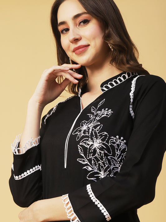 Solid Resham Embroidered Crochet Lace Work Kurta...