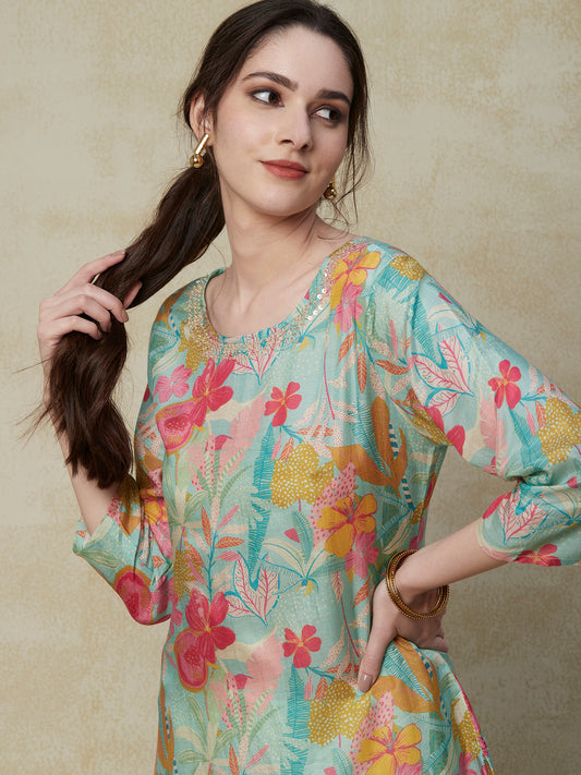 Floral Printed Sequins & Beads Embroidered Kurta...