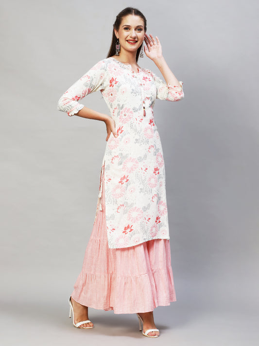 MRP (Inclusive of all taxes)Regular price ₹ 1,619.00₹ 1,619.00 Regular priceUnit price / per₹ 4,799.00Sale priceM L XL 2XL add to cartSale{"id":6782840111190,"title":"Floral Printed \u0026 Hand Embroidered Straight Fit Kurta with Sharara - Off White","handle":"floral-printed-hand-embroidered-straight-fit-kurta-with-sharara-off-white","description":"\u003cp data-mce-fragment=\"1\"\u003e\u003cspan style=\"font-weight: 400;\" data-mce-fragment=\"1\" data-mce-style=\"font-weight: 400;\"\u003e\u003c\/span\u003e\u003cspan style=\"font-weight: 400;\" data-mce-fragment=\"1\" data-mce-style=\"font-weight: 400;\"\u003eStyle: Kurta - Straight, Bottom - Sharara\u003c\/span\u003e\u003c\/p\u003e\n\u003cp data-mce-fragment=\"1\"\u003e\u003cspan style=\"font-weight: 400;\" data-mce-fragment=\"1\" data-mce-style=\"font-weight: 400;\"\u003eType: Everyday Wear\u003c\/span\u003e\u003c\/p\u003e\n\u003cp data-mce-fragment=\"1\"\u003e\u003cspan style=\"font-weight: 400;\" data-mce-fragment=\"1\" data-mce-style=\"font-weight: 400;\"\u003eNeckline: Round Neckline\u003c\/span\u003e\u003c\/p\u003e\n\u003cp data-mce-fragment=\"1\"\u003e\u003cspan style=\"font-weight: 400;\" data-mce-fragment=\"1\" data-mce-style=\"font-weight: 400;\"\u003eSleeve Pattern: Regular Sleeves\u003c\/span\u003e\u003c\/p\u003e\n\u003cp data-mce-fragment=\"1\"\u003e\u003cspan style=\"font-weight: 400;\" data-mce-fragment=\"1\" data-mce-style=\"font-weight: 400;\"\u003eSleeve Length: 3\/4th\u003c\/span\u003e\u003c\/p\u003e\n\u003cp data-mce-fragment=\"1\"\u003e\u003cspan style=\"font-weight: 400;\" data-mce-fragment=\"1\" data-mce-style=\"font-weight: 400;\"\u003eProduct Details:\u003c\/span\u003e\u003c\/p\u003e\n\u003cul data-mce-fragment=\"1\"\u003e\n\u003cli data-mce-fragment=\"1\"\u003e\u003cspan style=\"font-weight: 400;\" data-mce-fragment=\"1\" data-mce-style=\"font-weight: 400;\"\u003e Straight Fit Kurta\u003c\/span\u003e\u003c\/li\u003e\n\u003cli data-mce-fragment=\"1\"\u003e\u003cspan style=\"font-weight: 400;\" data-mce-fragment=\"1\" data-mce-style=\"font-weight: 400;\"\u003e Floral Prints all over\u003c\/span\u003e\u003c\/li\u003e\n\u003cli data-mce-fragment=\"1\"\u003e\u003cspan style=\"font-weight: 400;\" data-mce-fragment=\"1\" data-mce-style=\"font-weight: 400;\"\u003e Hand Embroidered Yoke\u003c\/span\u003e\u003c\/li\u003e\n\u003cli data-mce-fragment=\"1\"\u003e\u003cspan style=\"font-weight: 400;\" data-mce-fragment=\"1\" data-mce-style=\"font-weight: 400;\"\u003e Embellished with Beads \u0026amp; Kantha Detailing \u003c\/span\u003e\u003c\/li\u003e\n\u003cli data-mce-fragment=\"1\"\u003e\u003cspan style=\"font-weight: 400;\" data-mce-fragment=\"1\" data-mce-style=\"font-weight: 400;\"\u003e Front Placket Detailing \u003c\/span\u003e\u003c\/li\u003e\n\u003cli data-mce-fragment=\"1\"\u003e\u003cspan style=\"font-weight: 400;\" data-mce-fragment=\"1\" data-mce-style=\"font-weight: 400;\"\u003e Enhanced with Foil Mirror Embroidered Buttons\u003c\/span\u003e\u003c\/li\u003e\n\u003cli data-mce-fragment=\"1\"\u003e\u003cspan style=\"font-weight: 400;\" data-mce-fragment=\"1\" data-mce-style=\"font-weight: 400;\"\u003e Highlighted with Cutdana Work\u003c\/span\u003e\u003c\/li\u003e\n\u003cli data-mce-fragment=\"1\"\u003e\u003cspan style=\"font-weight: 400;\" data-mce-fragment=\"1\" data-mce-style=\"font-weight: 400;\"\u003e Paired with Ethnic Stripes Printed Sharara\u003c\/span\u003e\u003c\/li\u003e\n\u003cli data-mce-fragment=\"1\"\u003e\u003cspan style=\"font-weight: 400;\" data-mce-fragment=\"1\" data-mce-style=\"font-weight: 400;\"\u003e Partially Elasticated Waistline\u003c\/span\u003e\u003c\/li\u003e\n\u003cli data-mce-fragment=\"1\"\u003e\u003cspan style=\"font-weight: 400;\" data-mce-fragment=\"1\" data-mce-style=\"font-weight: 400;\"\u003e Hook \u0026amp; Side Zipper Closure\u003c\/span\u003e\u003c\/li\u003e\n\u003c\/ul\u003e\n\u003cp data-mce-fragment=\"1\"\u003e\u003cspan style=\"font-weight: 400;\" data-mce-fragment=\"1\" data-mce-style=\"font-weight: 400;\"\u003eModel’s Height: 5’7” ft. Size: Wearing Size S \u003c\/span\u003e\u003c\/p\u003e\n\u003ch1 data-mce-fragment=\"1\"\u003e\u003cspan style=\"font-weight: 400;\" data-mce-fragment=\"1\" data-mce-style=\"font-weight: 400;\"\u003eFabric Details\u003c\/span\u003e\u003c\/h1\u003e\n\u003cp data-mce-fragment=\"1\"\u003e\u003cspan style=\"font-weight: 400;\" data-mce-fragment=\"1\" data-mce-style=\"font-weight: 400;\"\u003eFabric: Kurta - Rayon, Bottom - Rayon\u003c\/span\u003e\u003c\/p\u003e\n\u003cp data-mce-fragment=\"1\"\u003e\u003cspan style=\"font-weight: 400;\" data-mce-fragment=\"1\" data-mce-style=\"font-weight: 400;\"\u003eColour: Kurta - Off White, Bottom - Pink\u003c\/span\u003e\u003c\/p\u003e\n\u003cp data-mce-fragment=\"1\"\u003e\u003cspan style=\"font-weight: 400;\" data-mce-fragment=\"1\" data-mce-style=\"font-weight: 400;\"\u003eWash Care: Hand wash in cold water\u003c\/span\u003e\u003c\/p\u003e\n\u003ch1\u003eGarment Measurements\u003c\/h1\u003e\n\u003cp\u003e\u003cstrong\u003eMeasurement (in inches) \u003c\/strong\u003e\u003c\/p\u003e\n\u003cp\u003eLength – 42, Sleeves – 15,\u003c\/p\u003e\n\u003cp\u003eBottom - 38\u003c\/p\u003e\n\u003ch1 data-mce-fragment=\"1\"\u003e\u003cspan data-mce-fragment=\"1\"\u003eProduct Information\u003c\/span\u003e\u003c\/h1\u003e\n\u003cp data-mce-fragment=\"1\"\u003e\u003cspan data-mce-fragment=\"1\"\u003e\u003cstrong\u003eManufactured\/Packed\/Marketed By:\u003c\/strong\u003e\u003cbr\u003e\u003c\/span\u003e\u003cspan data-mce-fragment=\"1\"\u003eFashor Lifestyle Pvt. Ltd.\u003cbr\u003e28\/30, Sudershanpura Industrial Area,\u003cbr\u003eJaipur - 302006.\u003cbr\u003e\u003cstrong\u003eCountry of Origin:\u003c\/strong\u003e India\u003c\/span\u003e\u003c\/p\u003e","published_at":"2025-11-17T09:51:57+05:30","created_at":"2022-07-20T12:06:13+05:30","vendor":"Fashor","type":"2P Kurta Set","tags":["1001-2000","10263","2000 - 3000","2001-3000","All Styles","bogo-zone","casualwear","colour_white","design_floral-pr