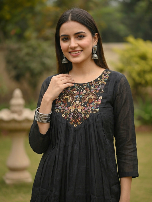 {"id":7847042973782,"title":"Solid Floral Resham Embroidered A-Line Co-ord Set - Black","handle":"solid-floral-resham-embroidered-a-line-co-ord-set-black","description":"\u003ch1\u003e\u003cstrong\u003eHighlights\u003c\/strong\u003e\u003c\/h1\u003e\n\u003cp\u003eTailored from luxurious muslin silk, the graceful A-line kurta features exquisite resham floral embroidery adorning the yoke, elevating a classic round neckline with artisanal detail. Complemented by solid, flowing palazzo pants, this ensemble blends comfort and elegance, making it the perfect choice for both festive gatherings and sophisticated evenings.\u003c\/p\u003e\n\n\u003ch1\u003e\u003cstrong\u003eFabric \u0026amp; Colour\u003c\/strong\u003e\u003c\/h1\u003e\n\u003cul\u003e\n\u003cli\u003eTop Colour: Black\u003c\/li\u003e\n\u003cli\u003eTop Fabric: Muslin Silk\u003c\/li\u003e\n\u003cli\u003eBottom Colour: Black\u003c\/li\u003e\n\u003cli\u003eBottom Fabric: Muslin Silk\u003c\/li\u003e\n\u003c\/ul\u003e\n\n\u003ch1\u003e\u003cstrong\u003eSpecifications\u003c\/strong\u003e\u003c\/h1\u003e\n\u003cul\u003e\n\u003cli\u003eTop Design: Solid\u003c\/li\u003e\n\u003cli\u003eTop Craft: Sequins, Embroidery, Plain and Prints\u003c\/li\u003e\n\u003cli\u003eTop Shape: A-line\u003c\/li\u003e\n\u003cli\u003eNeck: Round Neck\u003c\/li\u003e\n\u003cli\u003eSleeve Length: Three-Quarter Sleeves\u003c\/li\u003e\n\u003cli\u003eTop Length: Knee Length\u003c\/li\u003e\n\u003cli\u003eHemline: Flared\u003c\/li\u003e\n\u003cli\u003eSlit: NA\u003c\/li\u003e\n\u003cli\u003eBottom Type: Palazzos\u003c\/li\u003e\n\u003cli\u003eBottom Closure: Slip-On\u003c\/li\u003e\n\u003cli\u003eWaistband: Partially Elasticated\u003c\/li\u003e\n\u003c\/ul\u003e\n\n\u003cp\u003e\u003cstrong\u003eWash Care:\u003c\/strong\u003e Hand Wash\u003c\/p\u003e\n\n\u003ch1\u003e\u003cstrong\u003eLength (in inches)\u003c\/strong\u003e\u003c\/h1\u003e\n\u003cp\u003eKurta – 46, Sleeves – 17\u003cbr\u003eBottom – 36\u003c\/p\u003e\n\n\u003cp\u003eModel's Height: 5'7\". Wearing Size S.\u003c\/p\u003e\n\n\u003ch1\u003e\u003cstrong\u003eProduct Information\u003c\/strong\u003e\u003c\/h1\u003e\n\u003cp\u003eManufactured\/Packed\/Marketed By:\u003cbr\u003eFashor Lifestyle Pvt. Ltd.\u003cbr\u003e28\/30, Sudarshanpura Industrial Area,\u003cbr\u003eJaipur - 302006.\u003cbr\u003eCountry of Origin: India\u003c\/p\u003e","published_at":"2026-04-14T19:35:43+05:30","created_at":"2026-04-14T19:03:45+05:30","vendor":"FASHOR","type":"2P Kurta Set","tags":["1001-2000","2XL","casualwear","co-ord","Co-ord Set","colour_black","craft_embroidery","craft_plain-and-prints","craft_sequins","design_solid","Embroidered","fabric_muslin-silk","Festive Wear","L","M","S","shape_a-line","workwear","XL"],"price":126900,"price_min":126900,"price_max":126900,"available":true,"price_varies":false,"compare_at_price":289900,"compare_at_price_min":289900,"compare_at_price_max":289900,"compare_at_price_varies":false,"variants":[{"id":44499905413206,"title":"S","option1":"S","option2":null,"option3":null,"sku":"36-KBA32090G5OS","requires_shipping":true,"taxable":true,"featured_image":{"id":36661106311254,"product_id":7847042973782,"position":1,"created_at":"2026-04-14T18:53:02+05:30","updated_at":"2026-04-14T18:53:04+05:30","alt":null,"width":1080,"height":1440,"src":"\/\/fashor.com\/cdn\/shop\/files\/33412_1.jpg?v=1776172984","variant_ids":[44499905413206,44499905445974,44499905478742,44499905511510,44499905544278,44499905577046]},"available":true,"name":"Solid Floral Resham Embroidered A-Line Co-ord Set - Black - S","public_title":"S","options":["S"],"price":126900,"weight":0,"compare_at_price":289900,"inventory_quantity":7,"inventory_management":"shopify","inventory_policy":"deny","barcode":"","featured_media":{"alt":null,"id":28669611311190,"position":1,"preview_image":{"aspect_ratio":0.75,"height":1440,"width":1080,"src":"\/\/fashor.com\/cdn\/shop\/files\/33412_1.jpg?v=1776172984"}},"requires_selling_plan":false,"selling_plan_allocations":[],"quantity_rule":{"min":1,"max":null,"increment":1}},{"id":44499905445974,"title":"M","option1":"M","option2":null,"option3":null,"sku":"38-KBA32090G5OS","requires_shipping":true,"taxable":true,"featured_image":{"id":36661106311254,"product_id":7847042973782,"position":1,"created_at":"2026-04-14T18:53:02+05:30","updated_at":"2026-04-14T18:53:04+05:30","alt":null,"width":1080,"height":1440,"src":"\/\/fashor.com\/cdn\/shop\/files\/33412_1.jpg?v=1776172984","variant_ids":[44499905413206,44499905445974,44499905478742,44499905511510,44499905544278,44499905577046]},"available":true,"name":"Solid Floral Resham Embroidered A-Line Co-ord Set - Black - M","public_title":"M","options":["M"],"price":126900,"weight":0,"compare_at_price":289900,"inventory_quantity":2,"inventory_management":"shopify","inventory_policy":"deny","barcode":"","featured_media":{"alt":null,"id":28669611311190,"position":1,"preview_image":{"aspect_ratio":0.75,"height":1440,"width":1080,"src":"\/\/fashor.com\/cdn\/shop\/files\/33412_1.jpg?v=1776172984"}},"requires_selling_plan":false,"selling_plan_allocations":[],"quantity_rule":{"min":1,"max":null,"increment":1}},{"id":44499905478742,"title":"L","option1":"L","option2":null,"option3":null,"sku":"40-KBA32090G5OS","requires_shipping":true,"taxable":true,"featured_image":{"id":36661106311254,"product_id":7847042973782,"position":1,"created_at":"2026-04-14T18:53:02+05:30","updated_at":"2026-04-14T18:53:04+05:30","alt":null,"width":1080,"height":1440,"src":"\/\/fashor.com\/cdn\/shop\/files\/33412_1.jpg?v=1776172984","variant_ids":[44499905413206,44499905445974,44499905478742,44499905511510,44499905544278,44499905577046]},"available":true,"name":"Solid Floral Resham Embroidered A-Line Co-ord Set - Black - L","public_title":"L","options":["L"],"price":126900,"weight":0,"compare_at_price":289900,"inventory_quantity":2,"inventory_management":"shopify","inventory_policy":"deny","barcode":"","featured_media":{"alt":null,"id":28669611311190,"position":1,"preview_image":{"aspect_r