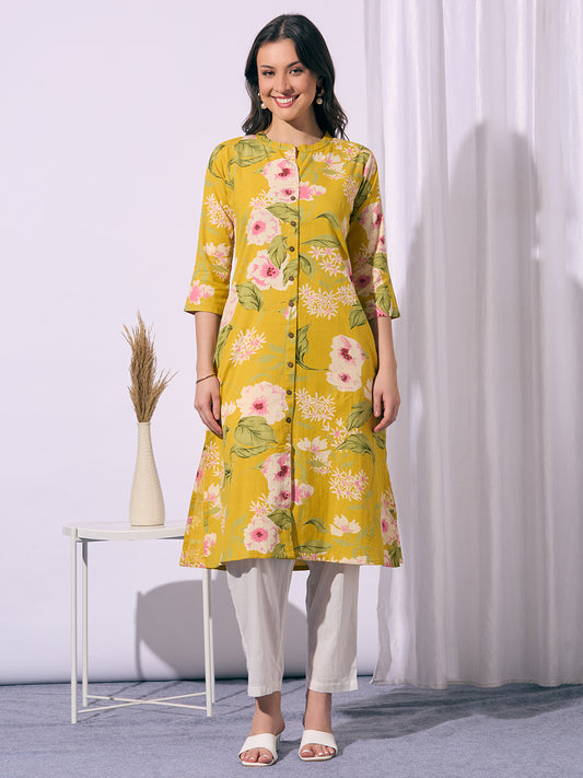Ethnic Floral Printed Embroidered Straight Fit Kurta...
