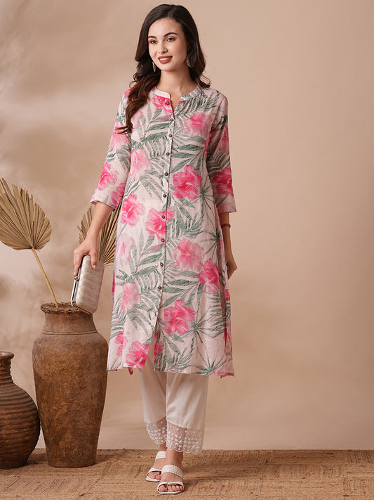 Abstract Floral Printed A-Line Cotton Flax Kurta...