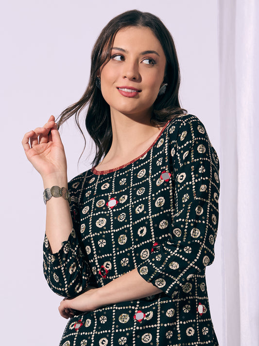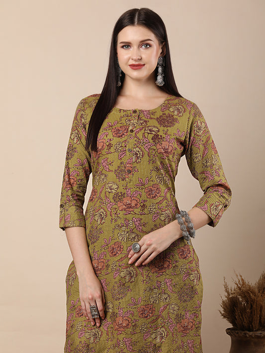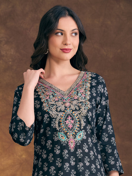 Ethnic Floral Printed & Embroidered Straight Fit...