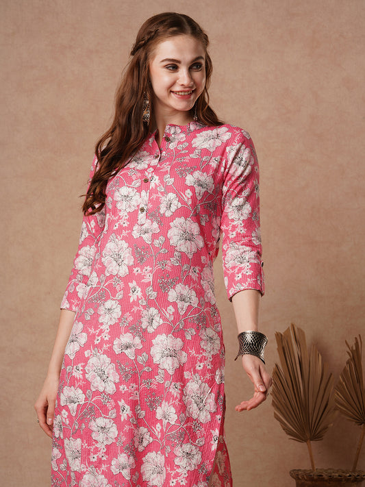 Solid Floral Chikankari Embroidered Straight Fit Kurti...