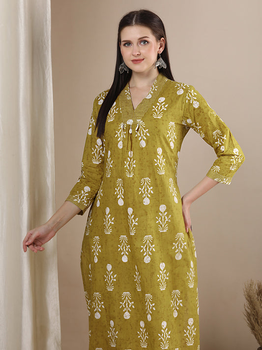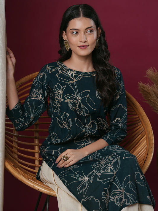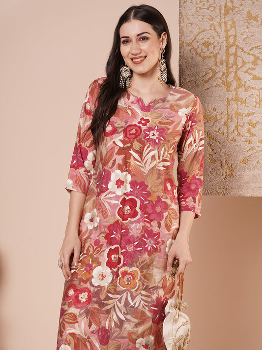 Ethnic Floral Printed Embroidered Straight Fit Kurta...