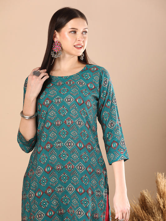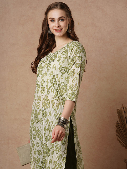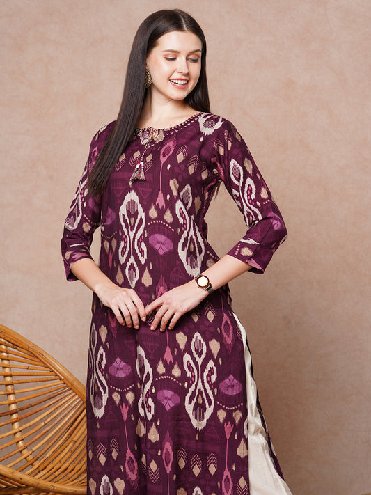 Ethnic Ikat Printed & Embroidered Straight Fit...