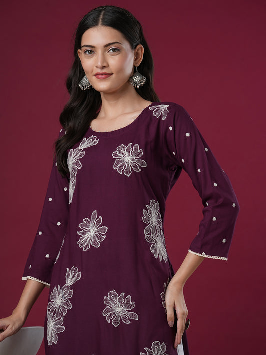 Solid Abstract Floral Embroidered Straight Fit Kurta...