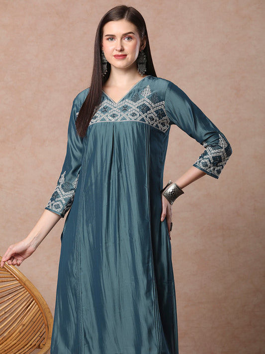 Solid Ethnic Embroidered Straight Fit Kurta -...