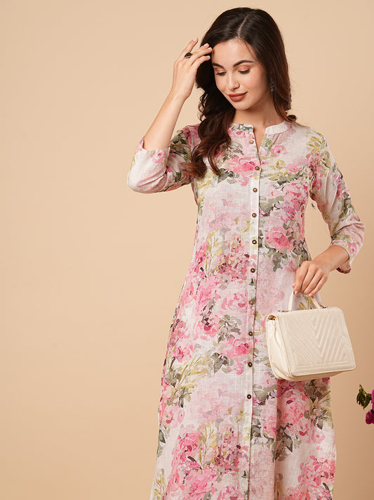 Abstract Floral Printed A-Line Cotton Flax Kurta...