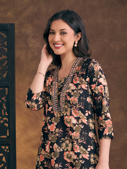 Ethnic Floral Printed Embroidered Straight Fit Kurta...