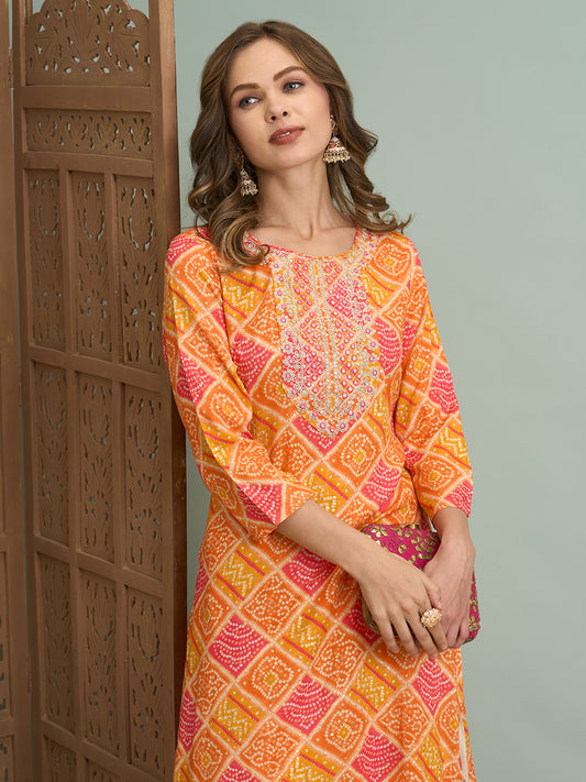 Ethnic Bandhani Printed & Embroidered Straight Fit...