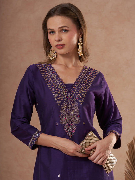 Ethnic Floral Printed & Embroidered Straight Fit...