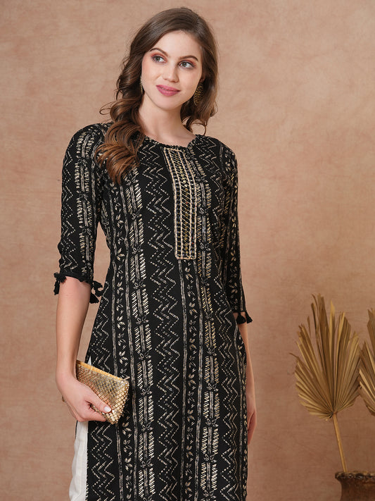 Ethnic Chevron Printed & Embroidered Straight Fit...
