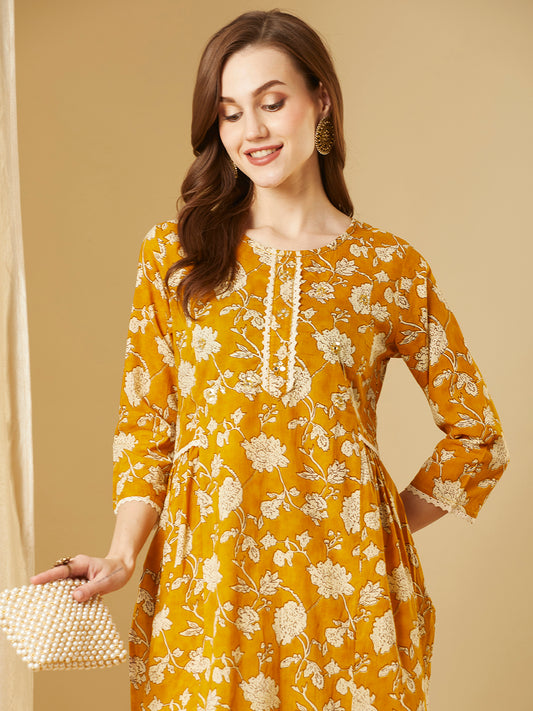 Ethnic Floral Printed A-Line Pleated Kurta -...