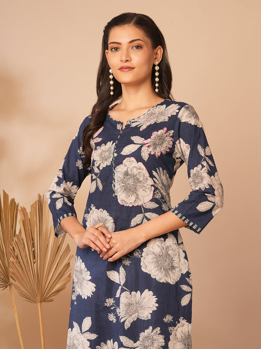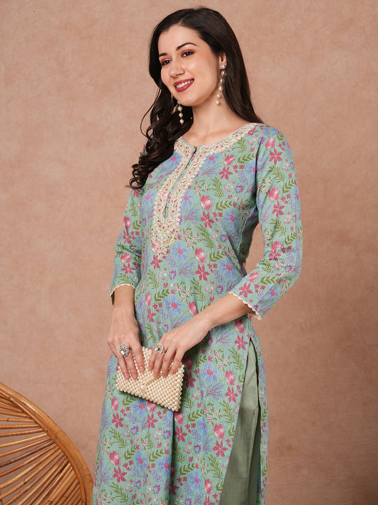 Ethnic Floral Printed Embroidered Straight Fit Kurta...