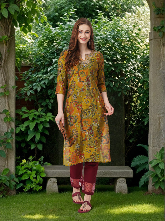 MRP (Inclusive of all taxes)Regular price ₹ 1,299.00₹ 1,299.00 Regular priceUnit price / per₹ 3,299.00Sale priceM L XL 2XL 3XL add to cartSale{"id":7564507873366,"title":"Ethnic \u0026 Floral Printed \u0026 Dori Embroidered Straight Fit Kurta - Mustard","handle":"ethnic-floral-printed-dori-embroidered-straight-fit-kurta-mustard","description":"\u003ch1\u003eHighlights\u003cbr\u003e\n\u003c\/h1\u003e\n\u003cp\u003e\u003cbr\u003e-Step into effortless elegance with this Mustard Ethnic Floral Printed Straight Fit Kurta, crafted from soft, flowy Muslin Silk for all-day ease. The graceful straight silhouette flatters every body type while offering a polished, contemporary look. A delicate Keyhole neckline adds a touch of understated charm, perfect for everyday wear or special gatherings. The highlight of the piece is its exquisite Threadwork \u0026amp; Dori embroidery, bringing in the richness of traditional craftsmanship. Ethnic floral prints blend modern artistry with cultural elegance, creating a refined yet vibrant aesthetic. Style it with minimal accessories and straight pants for a chic, timeless ensemble.\u003c\/p\u003e\n\u003ch1\u003eFabric \u0026amp; Colour\u003c\/h1\u003e\n\u003cp\u003e\u003cbr\u003eColour: Mustard\u003cbr\u003eFabric: Muslin Silk\u003c\/p\u003e\n\u003ch1\u003eSpecifications\u003c\/h1\u003e\n\u003cp\u003e\u003cbr\u003eDesign: Floral print, Ethnic print, Solid\u003cbr\u003eCraft: Threadwork, Zari\u003cbr\u003eShape: Straight\u003cbr\u003eNeck: Keyhole Neckline\u003cbr\u003eSleeve Length: Three-Quarter Sleeves\u003cbr\u003eTop Length: Knee Length\u003cbr\u003eHemline: Straight\u003cbr\u003eSlit: Side Slits\u003c\/p\u003e\n\u003cp\u003eWash Care: Machine Wash\u003c\/p\u003e\n\u003cp\u003eLength (in inches)\u003cbr\u003eKurta – 44, Sleeves – 17\u003c\/p\u003e\n\u003cp\u003eModel’s Height: 5’7”. Wearing Size S.\u003c\/p\u003e\n\u003ch1\u003eProduct Information\u003c\/h1\u003e\n\u003cp\u003e\u003cbr\u003eManufactured\/Packed\/Marketed By:\u003cbr\u003eFashor Lifestyle Pvt. Ltd.\u003cbr\u003e28\/30, Sudarshanpura Industrial Area,\u003cbr\u003eJaipur - 302006.\u003cbr\u003eCountry of Origin: India\u003c\/p\u003e","published_at":"2025-10-16T11:43:23+05:30","created_at":"2025-06-02T06:32:19+05:30","vendor":"FASHOR","type":"Kurtas","tags":["1001-2000","27874","2XL","All Styles","casualwear","colour_mustard","craft_thread-work","craft_zari","design_ethnic-print","design_floral-print","design_solid","fabric_muslin-silk","KURTI","kurtis","meta-size-chart-","monsoo","now-trending","rakhi-favourites","shape_straight","single-kurta","workwear"],"price":129900,"price_min":129900,"price_max":129900,"available":true,"price_varies":false,"compare_at_price":329900,"compare_at_price_min":329900,"compare_at_price_max":329900,"compare_at_price_varies":false,"variants":[{"id":42351632515158,"title":"M","option1":"M","option2":null,"option3":null,"sku":"38-KAB27874A5FS","requires_shipping":true,"taxable":false,"featured_image":{"id":34474717741142,"product_id":7564507873366,"position":4,"created_at":"2025-06-02T06:32:51+05:30","updated_at":"2025-06-02T06:33:22+05:30","alt":null,"width":1080,"height":1440,"src":"\/\/fashor.com\/cdn\/shop\/files\/31036_3.jpg?v=1748826202","variant_ids":[42351632515158,42351632547926,42351632580694,42351632613462,42351632646230]},"available":false,"name":"Ethnic \u0026 Floral Printed \u0026 Dori Embroidered Straight Fit Kurta - Mustard - M","public_title":"M","options":["M"],"price":129900,"weight":0,"compare_at_price":329900,"inventory_quantity":0,"inventory_management":"shopify","inventory_policy":"deny","barcode":"","featured_media":{"alt":null,"id":26810946191446,"position":4,"preview_image":{"aspect_ratio":0.75,"height":1440,"width":1080,"src":"\/\/fashor.com\/cdn\/shop\/files\/31036_3.jpg?v=1748826202"}},"requires_selling_plan":false,"selling_plan_allocations":[],"quantity_rule":{"min":1,"max":null,"increment":1}},{"id":42351632547926,"title":"L","option1":"L","option2":null,"option3":null,"sku":"40-KAB27874A5FS","requires_shipping":true,"taxable":false,"featured_image":{"id":34474717741142,"product_id":7564507873366,"position":4,"created_at":"2025-06-02T06:32:51+05:30","updated_at":"2025-06-02T06:33:22+05:30","alt":null,"width":1080,"height":1440,"src":"\/\/fashor.com\/cdn\/shop\/files\/31036_3.jpg?v=1748826202","variant_ids":[42351632515158,42351632547926,42351632580694,42351632613462,42351632646230]},"available":false,"name":"Ethnic \u0026 Floral Printed \u0026 Dori Embroidered Straight Fit Kurta - Mustard - L","public_title":"L","options":["L"],"price":129900,"weight":0,"compare_at_price":329900,"inventory_quantity":0,"inventory_management":"shopify","inventory_policy":"deny","barcode":"","featured_media":{"alt":null,"id":26810946191446,"position":4,"preview_image":{"aspect_ratio":0.75,"height":1440,"width":1080,"src":"\/\/fashor.com\/cdn\/shop\/files\/31036_3.jpg?v=1748826202"}},"requires_selling_plan":false,"selling_plan_allocations":[],"quantity_rule":{"min":1,"max":null,"increment":1}},{"id":42351632580694,"title":"XL","option1":"XL","option2":null,"option3":null,"sku":"42-KAB27874A5FS","requires_shipping":true,"taxable":false,"featured_image":{"id":34474717741142,"product_id":7564507873366,"position":4,"created_at":"2025-06-02T06:32:51+05:30","updated_at":"2025-06-02T06:33:22+05:30","alt":null,"width":1080,"height":1440,"src":"\/\/fashor.com\/cdn\/shop\/files\/31036_3.jpg?v=1748826202","variant_ids":[42351632515158,42351632547926,42351632580694,42351632613462,42351632646230]},"available":false,"name":"Ethnic \u0026 Floral Printed \u0026 Dori Embroidered Straight Fit Kurta - Mustard - XL","public_title":"XL","options":["XL"],"price":129900,"weight":0,"compare_at_price":329900,"inventory_quantity":0,"inventory_management":"shopify","inventory_policy":"deny","barcode":"","featured_media":{"alt":null,"id":26810946191446,"position":4,"preview_image":{"aspect_ratio":0.75,"height":1440,"width":1080,"src":"\/\/fashor.com\/cdn\/shop\/files\/