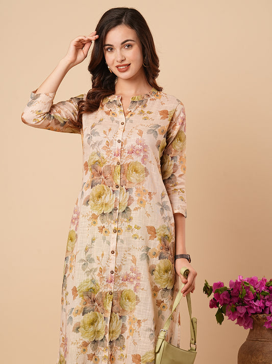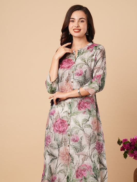 Abstract Floral Printed A-Line Cotton Flax Kurta...