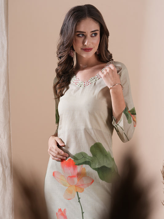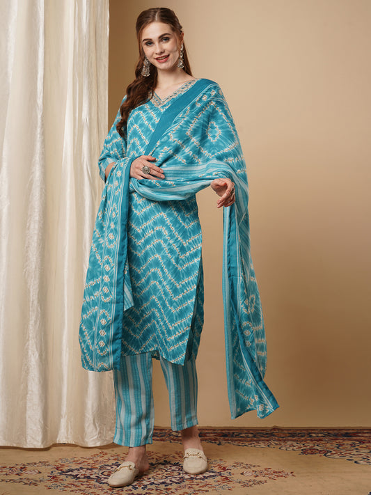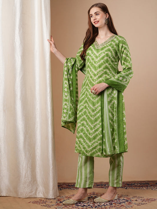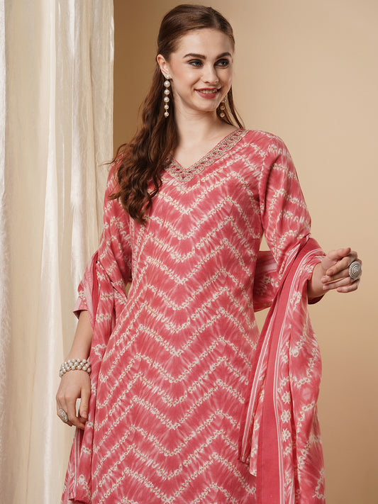 Ethnic Chevron Printed & Embroidered Straight Kurta...