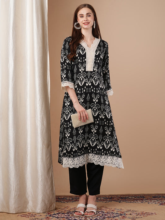 Ethnic Ikat Printed A-Line Flared Kurta with...