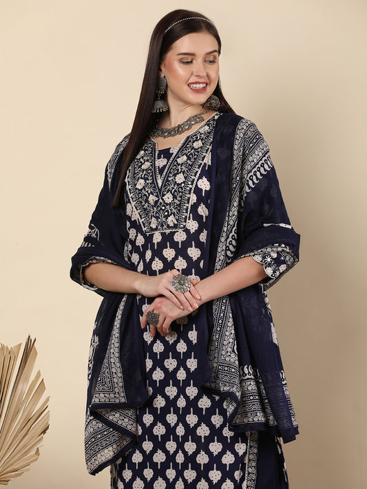 Ethnic Floral Printed Kantha Embroidered Straight Cut...