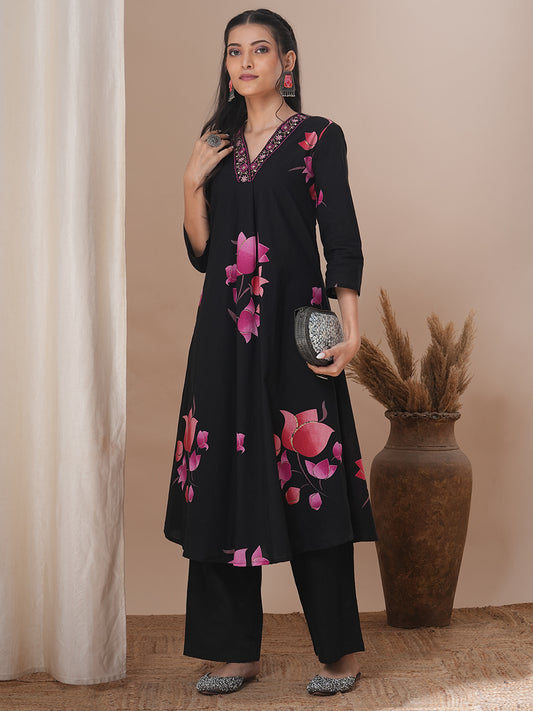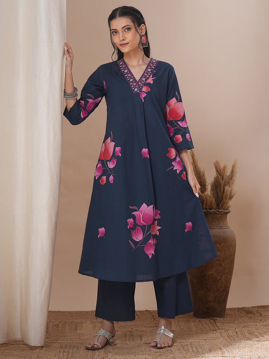 Lotus Printed & Embroidered A-Line Kurta with...