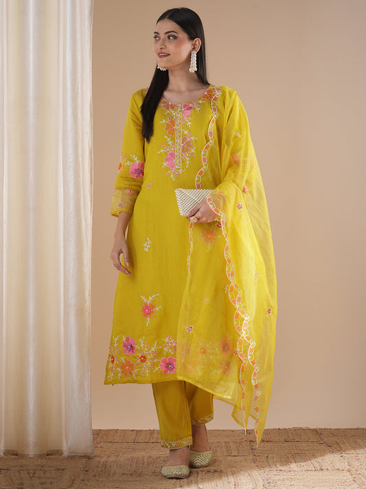 Solid Ethnic Floral Thread Embroidered Straight Fit...