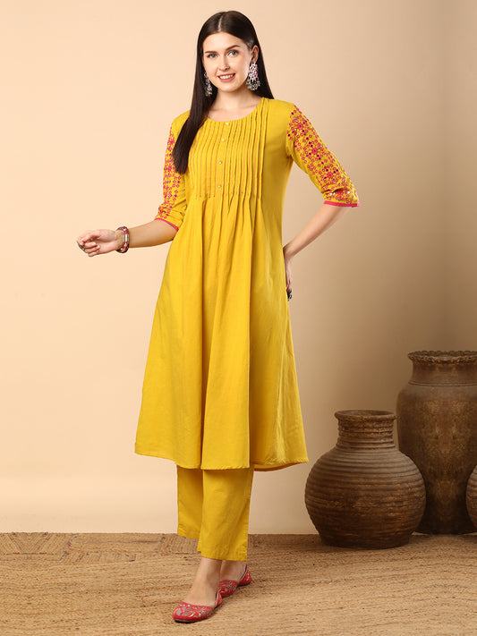 MRP (Inclusive of all taxes)Regular price ₹ 1,199.00₹ 1,199.00 Regular priceUnit price / per₹ 4,299.00Sale priceS M L XL 2XL 3XL add to cartSale{"id":7695143370838,"title":"Solid Pin Tucked \u0026 Geometric Floral Embroidered A-Line Pleated Co-ord Set - Yellow","handle":"solid-pin-tucked-geometric-floral-embroidered-a-line-pleated-co-ord-set-yellow","description":"\u003ch1\u003eHighlights\u003c\/h1\u003e\n\u003cp\u003e\u003cbr\u003e\u003cbr\u003e-Add a touch of understated elegance to your everyday wardrobe with this A-line kurta, featuring delicate pintuck detailing along the yoke for a refined and structured look. The sleeves are adorned with intricate geometric floral embroidery, blending tradition with a modern twist. Crafted for comfort and style, it is paired with solid, matching palazzo pants that offer ease of movement and a cohesive finish. Perfect for daily wear!\u003c\/p\u003e\n\u003ch1\u003e\n\u003cbr\u003eFabric \u0026amp; Colour\u003c\/h1\u003e\n\u003cp\u003e\u003cbr\u003eTop Colour: Yellow\u003cbr\u003eTop Fabric: Cotton\u003cbr\u003eBottom Colour: Yellow\u003cbr\u003eBottom Fabric: Cotton Blend\u003c\/p\u003e\n\u003ch1\u003eSpecifications\u003c\/h1\u003e\n\u003cp\u003e\u003cbr\u003eTop Design: Solid\u003cbr\u003eTop Craft: Mirror work\u003cbr\u003eTop Shape: A-line\u003cbr\u003eNeck: Round Neck\u003cbr\u003eSleeve Length: Three-Quarter Sleeves\u003cbr\u003eTop Length: Calf Length\u003cbr\u003eHemline: Flared\u003cbr\u003e\u003c\/p\u003e\n\u003cp\u003eBottom Type: Palazzos\u003cbr\u003eBottom Closure: Slip-On\u003cbr\u003eWaistband: Elasticated\u003c\/p\u003e\n\u003cp\u003eWash Care: Machine Wash\u003c\/p\u003e\n\u003cp\u003eLength (in inches)\u003cbr\u003eKurta – 45, Sleeves – 14,\u003cbr\u003eBottom - 40\u003c\/p\u003e\n\u003cp\u003eModel’s Height: 5’7”. Wearing Size S.\u003c\/p\u003e\n\u003ch1\u003eProduct Information\u003c\/h1\u003e\n\u003cp\u003e\u003cbr\u003eManufactured\/Packed\/Marketed By:\u003cbr\u003eFashor Lifestyle Pvt. Ltd.\u003cbr\u003e28\/30, Sudarshanpura Industrial Area,\u003cbr\u003eJaipur - 302006.\u003cbr\u003eCountry of Origin: India\u003c\/p\u003e","published_at":"2025-11-01T11:29:47+05:30","created_at":"2025-10-31T16:35:24+05:30","vendor":"FASHOR","type":"2P Kurta Set","tags":["1001-2000","2XL","30307","3XL","All Styles","casualwear","co-ord","colour_yellow","craft_mirror-work","design_solid","discount-zone","fabric_cotton","KURTI","kurtis","L","M","meta-size-chart-","now-trending","offer-zone","S","shape_a-line","workwear","XL"],"price":119900,"price_min":119900,"price_max":119900,"available":true,"price_varies":false,"compare_at_price":429900,"compare_at_price_min":429900,"compare_at_price_max":429900,"compare_at_price_varies":false,"variants":[{"id":43564097339478,"title":"S","option1":"S","option2":null,"option3":null,"sku":"36-KBB30307B5FS","requires_shipping":true,"taxable":false,"featured_image":{"id":35526964838486,"product_id":7695143370838,"position":2,"created_at":"2025-10-31T16:36:37+05:30","updated_at":"2025-10-31T16:37:25+05:30","alt":null,"width":1080,"height":1440,"src":"\/\/fashor.com\/cdn\/shop\/files\/30244_1.jpg?v=1761908845","variant_ids":[43564097339478,43564097372246,43564097405014,43564097437782,43564097470550,43564097503318]},"available":true,"name":"Solid Pin Tucked \u0026 Geometric Floral Embroidered A-Line Pleated Co-ord Set - Yellow - S","public_title":"S","options":["S"],"price":119900,"weight":0,"compare_at_price":429900,"inventory_quantity":1,"inventory_management":"shopify","inventory_policy":"deny","barcode":"","featured_media":{"alt":null,"id":27613120331862,"position":2,"preview_image":{"aspect_ratio":0.75,"height":1440,"width":1080,"src":"\/\/fashor.com\/cdn\/shop\/files\/30244_1.jpg?v=1761908845"}},"requires_selling_plan":false,"selling_plan_allocations":[],"quantity_rule":{"min":1,"max":null,"increment":1}},{"id":43564097372246,"title":"M","option1":"M","option2":null,"option3":null,"sku":"38-KBB30307B5FS","requires_shipping":true,"taxable":false,"featured_image":{"id":35526964838486,"product_id":7695143370838,"position":2,"created_at":"2025-10-31T16:36:37+05:30","updated_at":"2025-10-31T16:37:25+05:30","alt":null,"width":1080,"height":1440,"src":"\/\/fashor.com\/cdn\/shop\/files\/30244_1.jpg?v=1761908845","variant_ids":[43564097339478,43564097372246,43564097405014,43564097437782,43564097470550,43564097503318]},"available":true,"name":"Solid Pin Tucked \u0026 Geometric Floral Embroidered A-Line Pleated Co-ord Set - Yellow - M","public_title":"M","options":["M"],"price":119900,"weight":0,"compare_at_price":429900,"inventory_quantity":13,"inventory_management":"shopify","inventory_policy":"deny","barcode":"","featured_media":{"alt":null,"id":27613120331862,"position":2,"preview_image":{"aspect_ratio":0.75,"height":1440,"width":1080,"src":"\/\/fashor.com\/cdn\/shop\/files\/30244_1.jpg?v=1761908845"}},"requires_selling_plan":false,"selling_plan_allocations":[],"quantity_rule":{"min":1,"max":null,"increment":1}},{"id":43564097405014,"title":"L","option1":"L","option2":null,"option3":null,"sku":"40-KBB30307B5FS","requires_shipping":true,"taxable":false,"featured_image":{"id":35526964838486,"product_id":7695143370838,"position":2,"created_at":"2025-10-31T16:36:37+05:30","updated_at":"2025-10-31T16:37:25+05:30","alt":null,"width":1080,"height":1440,"src":"\/\/fashor.com\/cdn\/shop\/files\/30244_1.jpg?v=1761908845","variant_ids":[43564097339478,43564097372246,43564097405014,43564097437782,43564097470550,43564097503318]},"available":true,"name":"Solid Pin Tucked \u0026 Geometric Floral Embroidered A-Line Pleated Co-ord Set - Yellow - L","public_title":"L","options":["L"],"price":119900,"weight":0,"compare_at_price":429900,"inventory_quantity":15,"inventory_management":"shopify","inventory_policy":"deny","barcode":"","featured_media":{"alt":null,"id":27613120331862,"position":2,"preview_image":{"aspect_ratio":0.75,"height":1440,"width":1080,"src":"\/\/fashor.com\/cdn\/shop\/files\/30244_1.jpg?v=1761908845"