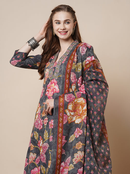 Floral Printed & Embroidered Anarkali Flared Kurta...