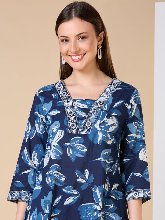 Ethnic Floral Printed & Embroidered A-Line Kurta...