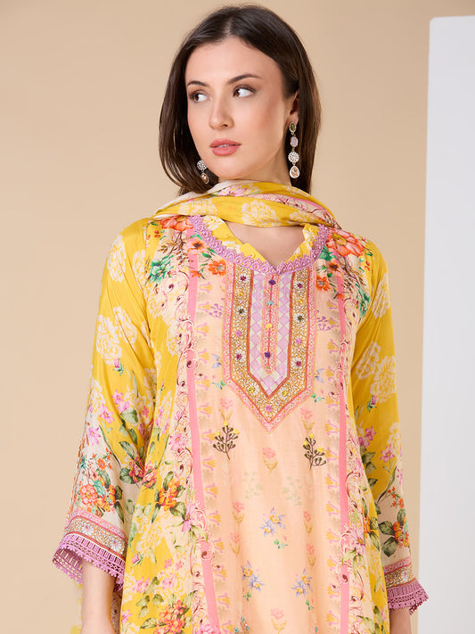 Ethnic Floral Printed & Embroidered Straight Fit...