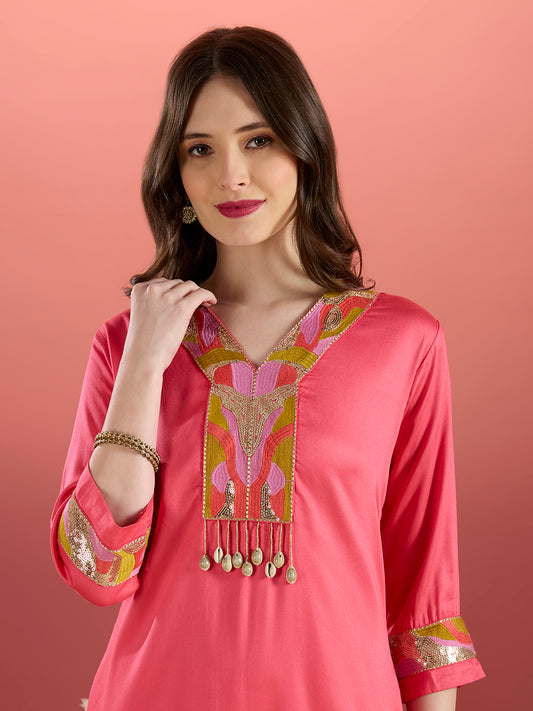 MRP (Inclusive of all taxes)Regular price ₹ 2,299.00₹ 2,299.00 Regular priceUnit price / per₹ 5,799.00Sale priceM L XL 2XL 3XL add to cartSale{"id":7721010921558,"title":"Solid Sequin Embroidered Straight Fit Co-ord Set - Pink","handle":"solid-sequin-embroidered-straight-fit-co-ord-set-pink","description":"\u003ch1\u003eHighlights\u003c\/h1\u003e\n\u003cp\u003e\u003cbr\u003e\u003cbr\u003e-Solid Sequin Embroidered Straight-Fit Co-ord Set in Pink—a dreamy blend of elegance and sparkle. Crafted from soft viscose rayon, this set drapes beautifully for an effortlessly refined look. The V-neckline adds a touch of sophistication, while delicate sequin embroidery brings just the right amount of shimmer. Perfect for celebrations, soirées, or making any moment feel special, this co-ord set delivers comfort, charm, and timeless style in one stunning ensemble.\u003c\/p\u003e\n\u003ch1\u003e\n\u003cbr\u003eFabric \u0026amp; Colour\u003c\/h1\u003e\n\u003cp\u003e\u003cbr\u003eTop Colour: Pink\u003cbr\u003eTop Fabric: Viscose Rayon\u003cbr\u003eBottom Colour: Pink\u003cbr\u003eBottom Fabric: Viscose Rayon\u003c\/p\u003e\n\u003ch1\u003eSpecifications\u003c\/h1\u003e\n\u003cp\u003e\u003cbr\u003eTop Design: Solid\u003cbr\u003eTop Craft: Embroidery, Plain and Prints\u003cbr\u003eTop Shape: Straight\u003cbr\u003eNeck: V-Neck\u003cbr\u003eSleeve Length: Three-Quarter Sleeves\u003cbr\u003eTop Length: Calf Length\u003cbr\u003eHemline: Straight\u003cbr\u003eSlit: Side Slits\u003c\/p\u003e\n\u003cp\u003eBottom Type: Trousers\u003cbr\u003eBottom Closure: Slip-On\u003cbr\u003eWaistband: Partially Elasticated\u003c\/p\u003e\n\u003cp\u003eWash Care: Machine Wash\u003c\/p\u003e\n\u003cp\u003eLength (in inches)\u003cbr\u003eKurta – 45, Sleeves – 16,\u003cbr\u003eBottom - 42\u003c\/p\u003e\n\u003cp\u003eModel’s Height: 5’7”. Wearing Size S.\u003c\/p\u003e\n\u003ch1\u003eProduct Information\u003c\/h1\u003e\n\u003cp\u003e\u003cbr\u003eManufactured\/Packed\/Marketed By:\u003cbr\u003eFashor Lifestyle Pvt. Ltd.\u003cbr\u003e28\/30, Sudarshanpura Industrial Area,\u003cbr\u003eJaipur - 302006.\u003cbr\u003eCountry of Origin: India\u003c\/p\u003e","published_at":"2025-11-27T13:39:37+05:30","created_at":"2025-11-27T10:40:41+05:30","vendor":"FASHOR","type":"2P Kurta Set","tags":["2001-3000","2XL","33587","3XL","All Styles","casualwear","colour_pink","craft_embroidery","craft_plain-and-prints","design_solid","fabric_viscose-rayon","KURTI","kurtis","L","M","meta-size-chart-","now-trending","shape_straight","XL"],"price":229900,"price_min":229900,"price_max":229900,"available":true,"price_varies":false,"compare_at_price":579900,"compare_at_price_min":579900,"compare_at_price_max":579900,"compare_at_price_varies":false,"variants":[{"id":43683438526550,"title":"M","option1":"M","option2":null,"option3":null,"sku":"38-KB033587J5FS","requires_shipping":true,"taxable":true,"featured_image":{"id":35733241757782,"product_id":7721010921558,"position":1,"created_at":"2025-11-27T10:41:15+05:30","updated_at":"2025-11-27T10:41:17+05:30","alt":null,"width":1080,"height":1440,"src":"\/\/fashor.com\/cdn\/shop\/files\/32785_1.jpg?v=1764220277","variant_ids":[43683438526550,43683438559318,43683438592086,43683438624854,43683438657622]},"available":true,"name":"Solid Sequin Embroidered Straight Fit Co-ord Set - Pink - M","public_title":"M","options":["M"],"price":229900,"weight":0,"compare_at_price":579900,"inventory_quantity":2,"inventory_management":"shopify","inventory_policy":"deny","barcode":"","featured_media":{"alt":null,"id":27816046461014,"position":1,"preview_image":{"aspect_ratio":0.75,"height":1440,"width":1080,"src":"\/\/fashor.com\/cdn\/shop\/files\/32785_1.jpg?v=1764220277"}},"requires_selling_plan":false,"selling_plan_allocations":[],"quantity_rule":{"min":1,"max":null,"increment":1}},{"id":43683438559318,"title":"L","option1":"L","option2":null,"option3":null,"sku":"40-KB033587J5FS","requires_shipping":true,"taxable":true,"featured_image":{"id":35733241757782,"product_id":7721010921558,"position":1,"created_at":"2025-11-27T10:41:15+05:30","updated_at":"2025-11-27T10:41:17+05:30","alt":null,"width":1080,"height":1440,"src":"\/\/fashor.com\/cdn\/shop\/files\/32785_1.jpg?v=1764220277","variant_ids":[43683438526550,43683438559318,43683438592086,43683438624854,43683438657622]},"available":true,"name":"Solid Sequin Embroidered Straight Fit Co-ord Set - Pink - L","public_title":"L","options":["L"],"price":229900,"weight":0,"compare_at_price":579900,"inventory_quantity":3,"inventory_management":"shopify","inventory_policy":"deny","barcode":"","featured_media":{"alt":null,"id":27816046461014,"position":1,"preview_image":{"aspect_ratio":0.75,"height":1440,"width":1080,"src":"\/\/fashor.com\/cdn\/shop\/files\/32785_1.jpg?v=1764220277"}},"requires_selling_plan":false,"selling_plan_allocations":[],"quantity_rule":{"min":1,"max":null,"increment":1}},{"id":43683438592086,"title":"XL","option1":"XL","option2":null,"option3":null,"sku":"42-KB033587J5FS","requires_shipping":true,"taxable":true,"featured_image":{"id":35733241757782,"product_id":7721010921558,"position":1,"created_at":"2025-11-27T10:41:15+05:30","updated_at":"2025-11-27T10:41:17+05:30","alt":null,"width":1080,"height":1440,"src":"\/\/fashor.com\/cdn\/shop\/files\/32785_1.jpg?v=1764220277","variant_ids":[43683438526550,43683438559318,43683438592086,43683438624854,43683438657622]},"available":true,"name":"Solid Sequin Embroidered Straight Fit Co-ord Set - Pink - XL","public_title":"XL","options":["XL"],"price":229900,"weight":0,"compare_at_price":579900,"inventory_quantity":3,"inventory_management":"shopify","inventory_policy":"deny","barcode":"","featured_media":{"alt":null,"id":27816046461014,"position":1,"preview_image":{"aspect_ratio":0.75,"height":1440,"width":1080,"src":"\/\/fashor.com\/cdn\/shop\/files\/32785_1.jpg?v=1764220277"}},"requires_selling_plan":false,"selling_plan_allocations":[],"quantity_rule":{"min":1,"max":null,"increment":1}},{"id":43683438624854,"t