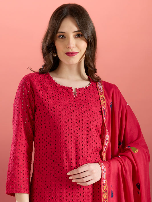 Solid Schiffli Floral Embroidered Straight Kurta with...