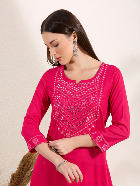 Solid Mirror Work Embroidered Straight Fit Kurta...