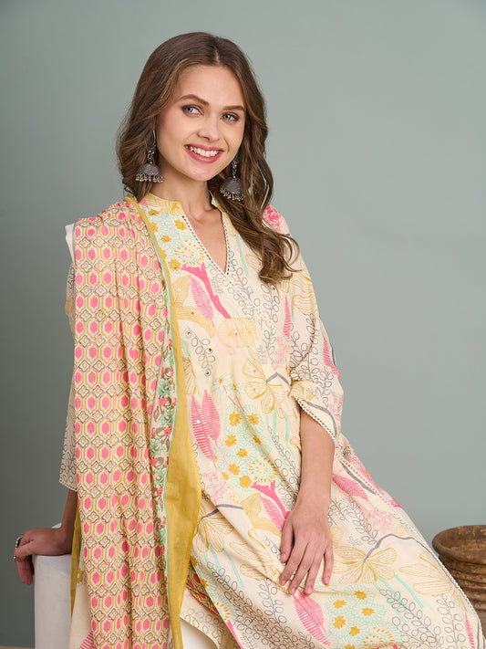 Abstract Floral Printed A-Line Paneled Kurta with...