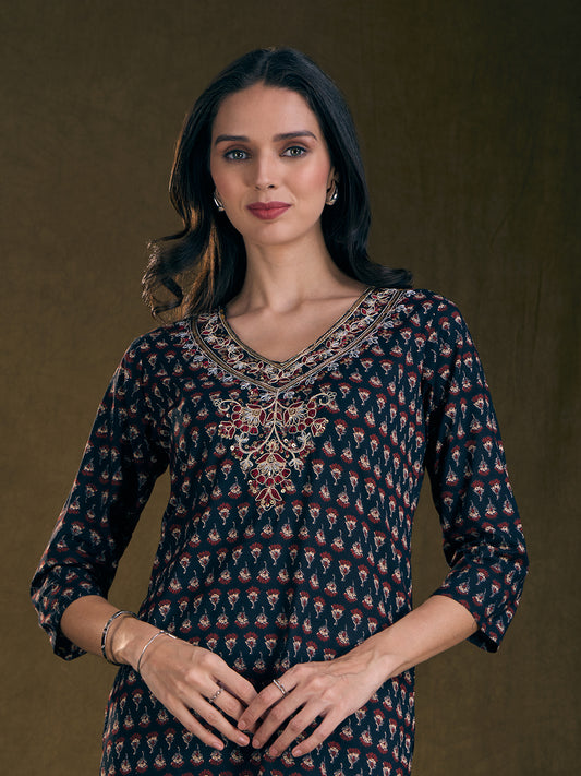 Ethnic Floral Printed & Embroidered A-Line Kurta...
