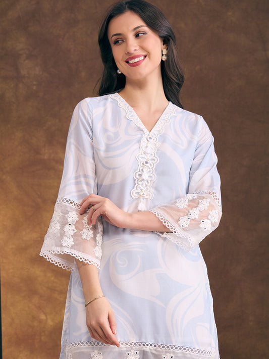 Abstract Printed & Mirror Embroidered Straight Fit...