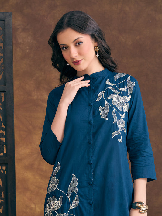 MRP (Inclusive of all taxes)Regular price ₹ 2,099.00₹ 2,099.00 Regular priceUnit price / per₹ 5,299.00Sale priceM L XL 2XL 3XL add to cartSale{"id":7606134603862,"title":"Solid Threadwork Sequin Work Embroidered A-Line Co-ord Set - Teal Blue","handle":"solid-threadwork-sequin-work-embroidered-a-line-co-ord-set-teal-blue","description":"\u003ch1\u003eHighlights\u003c\/h1\u003e\n\u003cp\u003e\u003cbr\u003e-Step into understated elegance with this Teal Blue Solid A-Line Co-ord Set. Crafted from soft cotton, it features a stylish Mandarin collar and is adorned with intricate threadwork and sequin embroidery across the front. Paired with a solid pant, this ensemble blends comfort with festive flair—perfect for day-to-evening wear.Fabric \u0026amp; Colour\u003c\/p\u003e\n\u003ch1\u003eFabric \u0026amp; Colour\u003c\/h1\u003e\n\u003cp\u003e\u003cbr\u003eTop Colour: Teal\u003cbr\u003eTop Fabric: Cotton\u003cbr\u003eBottom Colour: Teal\u003cbr\u003eBottom Fabric: Cotton Blend\u003c\/p\u003e\n\u003ch1\u003eSpecifications\u003c\/h1\u003e\n\u003cp\u003e\u003cbr\u003eTop Design: Solid\u003cbr\u003eTop Craft: Embroidery, Plain and Prints\u003cbr\u003eTop Shape: A-line\u003cbr\u003eNeck: Mandarin Collar\u003cbr\u003eSleeve Length: Three-Quarter Sleeves\u003cbr\u003eTop Length: Calf Length\u003cbr\u003eHemline: Flared\u003cbr\u003eSlit: Side Slits\u003c\/p\u003e\n\u003cp\u003eBottom Type: Trousers\u003cbr\u003eBottom Closure: Slip-On\u003cbr\u003eWaistband: Elasticated\u003c\/p\u003e\n\u003cp\u003eWash Care: Hand Wash\u003c\/p\u003e\n\u003cp\u003eLength (in inches)\u003cbr\u003eKurta – 45, Sleeves – 18,\u003cbr\u003eBottom - 40\u003c\/p\u003e\n\u003cp\u003eModel’s Height: 5’7”. Wearing Size S.\u003c\/p\u003e\n\u003ch1\u003eProduct Information\u003c\/h1\u003e\n\u003cp\u003e\u003cbr\u003eManufactured\/Packed\/Marketed By:\u003cbr\u003eFashor Lifestyle Pvt. Ltd.\u003cbr\u003e28\/30, Sudarshanpura Industrial Area,\u003cbr\u003eJaipur - 302006.\u003cbr\u003eCountry of Origin: India\u003c\/p\u003e","published_at":"2025-07-31T16:47:22+05:30","created_at":"2025-07-31T13:57:55+05:30","vendor":"FASHOR","type":"2P Kurta Set","tags":["2001-3000","2XL","31844","3XL","All Styles","casualwear","co-ord","colour_blue","craft_embroidery","craft_plain-and-prints","design_solid","fabric_cotton","KURTI","kurtis","L","M","meta-size-chart-","now-trending","shape_a-line","XL"],"price":209900,"price_min":209900,"price_max":209900,"available":true,"price_varies":false,"compare_at_price":529900,"compare_at_price_min":529900,"compare_at_price_max":529900,"compare_at_price_varies":false,"variants":[{"id":42536852160598,"title":"M","option1":"M","option2":null,"option3":null,"sku":"38-KBA31844F5FS","requires_shipping":true,"taxable":false,"featured_image":{"id":34819895230550,"product_id":7606134603862,"position":5,"created_at":"2025-07-31T13:58:33+05:30","updated_at":"2025-07-31T13:59:31+05:30","alt":null,"width":1080,"height":1440,"src":"\/\/fashor.com\/cdn\/shop\/files\/31631_7.jpg?v=1753950571","variant_ids":[42536852160598,42536852193366,42536852226134,42536852258902,42536852291670]},"available":true,"name":"Solid Threadwork Sequin Work Embroidered A-Line Co-ord Set - Teal Blue - M","public_title":"M","options":["M"],"price":209900,"weight":0,"compare_at_price":529900,"inventory_quantity":5,"inventory_management":"shopify","inventory_policy":"deny","barcode":"","featured_media":{"alt":null,"id":27016639086678,"position":5,"preview_image":{"aspect_ratio":0.75,"height":1440,"width":1080,"src":"\/\/fashor.com\/cdn\/shop\/files\/31631_7.jpg?v=1753950571"}},"requires_selling_plan":false,"selling_plan_allocations":[],"quantity_rule":{"min":1,"max":null,"increment":1}},{"id":42536852193366,"title":"L","option1":"L","option2":null,"option3":null,"sku":"40-KBA31844F5FS","requires_shipping":true,"taxable":false,"featured_image":{"id":34819895230550,"product_id":7606134603862,"position":5,"created_at":"2025-07-31T13:58:33+05:30","updated_at":"2025-07-31T13:59:31+05:30","alt":null,"width":1080,"height":1440,"src":"\/\/fashor.com\/cdn\/shop\/files\/31631_7.jpg?v=1753950571","variant_ids":[42536852160598,42536852193366,42536852226134,42536852258902,42536852291670]},"available":true,"name":"Solid Threadwork Sequin Work Embroidered A-Line Co-ord Set - Teal Blue - L","public_title":"L","options":["L"],"price":209900,"weight":0,"compare_at_price":529900,"inventory_quantity":1,"inventory_management":"shopify","inventory_policy":"deny","barcode":"","featured_media":{"alt":null,"id":27016639086678,"position":5,"preview_image":{"aspect_ratio":0.75,"height":1440,"width":1080,"src":"\/\/fashor.com\/cdn\/shop\/files\/31631_7.jpg?v=1753950571"}},"requires_selling_plan":false,"selling_plan_allocations":[],"quantity_rule":{"min":1,"max":null,"increment":1}},{"id":42536852226134,"title":"XL","option1":"XL","option2":null,"option3":null,"sku":"42-KBA31844F5FS","requires_shipping":true,"taxable":false,"featured_image":{"id":34819895230550,"product_id":7606134603862,"position":5,"created_at":"2025-07-31T13:58:33+05:30","updated_at":"2025-07-31T13:59:31+05:30","alt":null,"width":1080,"height":1440,"src":"\/\/fashor.com\/cdn\/shop\/files\/31631_7.jpg?v=1753950571","variant_ids":[42536852160598,42536852193366,42536852226134,42536852258902,42536852291670]},"available":true,"name":"Solid Threadwork Sequin Work Embroidered A-Line Co-ord Set - Teal Blue - XL","public_title":"XL","options":["XL"],"price":209900,"weight":0,"compare_at_price":529900,"inventory_quantity":4,"inventory_management":"shopify","inventory_policy":"deny","barcode":"","featured_media":{"alt":null,"id":27016639086678,"position":5,"preview_image":{"aspect_ratio":0.75,"height":1440,"width":1080,"src":"\/\/fashor.com\/cdn\/shop\/files\/31631_7.jpg?v=1753950571"}},"requires_selling_plan":false,"selling_plan_allocations":[],"quantity_rule":{"min":1,"max":null,"increment":1}},{"id":42536852258902,"title":"2XL","option1":"2XL","option2":null,"option3":null,"sku":"44-KBA31844F5FS","req