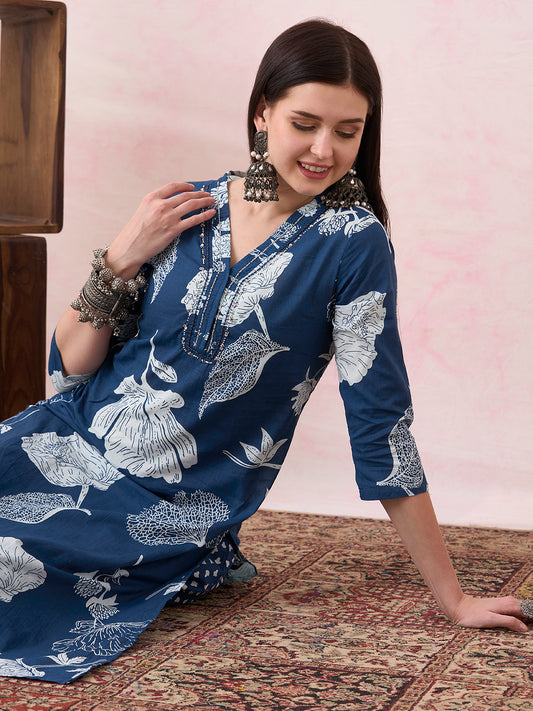 Abstract Floral Printed & Embroidered Straight Kurta...