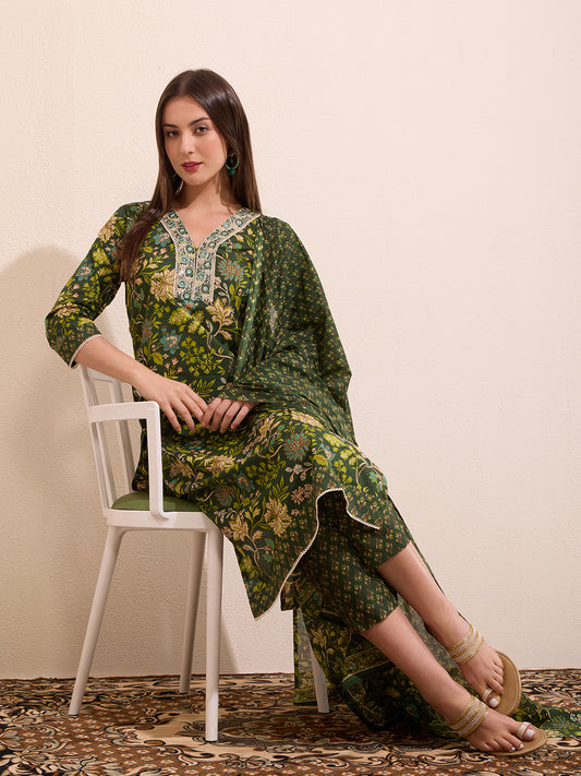 Ethnic Floral Printed & Embroidered Straight Fit...