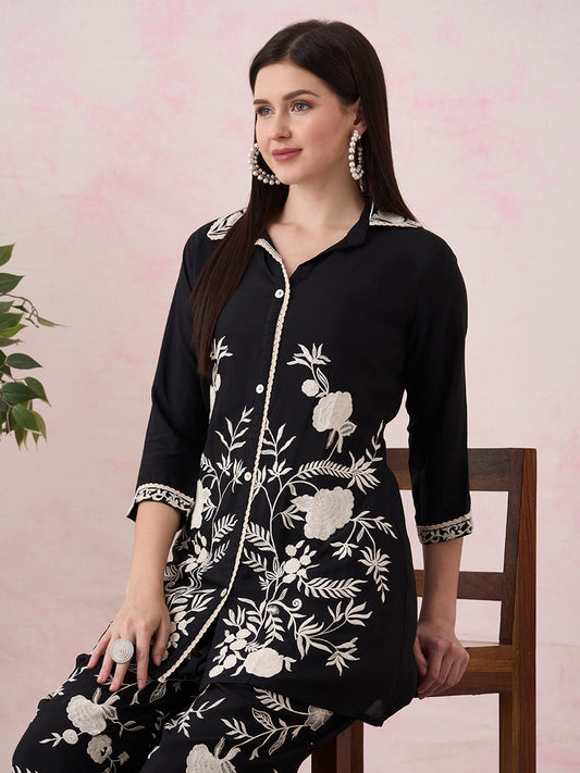 Solid Floral Threadwork Embroidered Straight Fit Kurta...