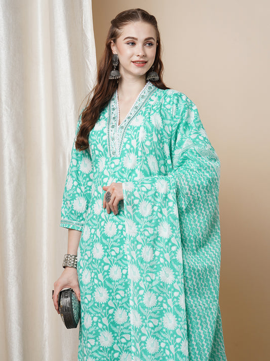 Ethnic Floral Printed Embroidered A-Line Kurta with...