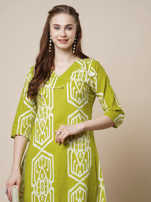 Ethnic Chevron Printed & Embroidered Straight Kurta...