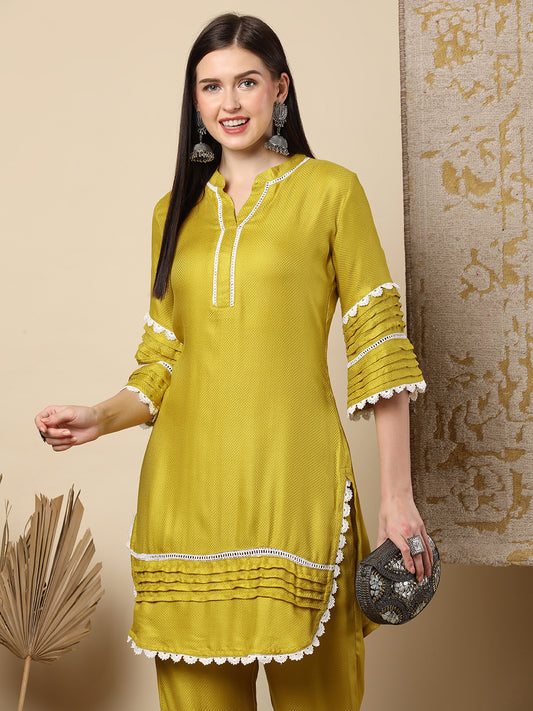 MRP (Inclusive of all taxes)Regular price ₹ 1,699.00₹ 1,699.00 Regular priceUnit price / per₹ 4,299.00Sale priceM L XL 2XL add to cartSale{"id":7542301032534,"title":"Solid Pin Tucked Straight Fit Co-ord Set - Lime Green","handle":"solid-pin-tucked-straight-fit-co-ord-set-lime-green","description":"\u003ch1\u003eHighlights\u003c\/h1\u003e\n\u003cp\u003e\u003cbr\u003e-This straight fit kurta with pin tucks detailing at front, features mandarin collar. Enhanced with crochet lace detailing all over, paired with solid matching pant. This ensemble offers both comfort and style. Ideal for everyday elegance, it’s a versatile outfit that transitions seamlessly from casual outings to more refined gatherings.\u003c\/p\u003e\n\u003ch1\u003eFabric \u0026amp; Colour\u003c\/h1\u003e\n\u003cp\u003e\u003cbr\u003eTop Colour: Lime Green\u003cbr\u003eTop Fabric: Viscose Rayon\u003cbr\u003eBottom Colour: Lime Green\u003cbr\u003eBottom Fabric: Viscose Rayon\u003c\/p\u003e\n\u003ch1\u003eSpecifications\u003c\/h1\u003e\n\u003cp\u003e\u003cbr\u003eTop Design: Solid\u003cbr\u003eTop Craft: Plain and Prints, Lace\u003cbr\u003eTop Shape: Straight\u003cbr\u003eNeck: Mandarin Collar\u003cbr\u003eSleeve Length: Short Sleeves\u003cbr\u003eTop Length: Above Knee\u003cbr\u003eHemline: Curved\u003cbr\u003eSlit: Side Slits\u003c\/p\u003e\n\u003cp\u003eBottom Type: Trousers\u003cbr\u003eBottom Closure: Slip-On\u003cbr\u003eWaistband: Partially Elasticated\u003c\/p\u003e\n\u003cp\u003eWash Care: Hand Wash\u003c\/p\u003e\n\u003cp\u003eLength (in inches)\u003cbr\u003eKurta – 36, Sleeves – 15,\u003cbr\u003eBottom - 42\u003c\/p\u003e\n\u003cp\u003eModel’s Height: 5’7”. Wearing Size S.\u003c\/p\u003e\n\u003ch1\u003eProduct Information\u003c\/h1\u003e\n\u003cp\u003e\u003cbr\u003eManufactured\/Packed\/Marketed By:\u003cbr\u003eFashor Lifestyle Pvt. Ltd.\u003cbr\u003e28\/30, Sudarshanpura Industrial Area,\u003cbr\u003eJaipur - 302006.\u003cbr\u003eCountry of Origin: India\u003c\/p\u003e","published_at":"2025-04-19T17:11:54+05:30","created_at":"2025-04-19T14:27:41+05:30","vendor":"FASHOR","type":"2P Kurta Set","tags":["1001-2000","2XL","30671","All Styles","casualwear","co-ord","colour_Green","craft_lace","craft_plain-and-prints","design_solid","fabric_viscose-rayon","KURTI","kurtis","L","M","meta-size-chart-","monsoo","now-trending","shape_straight","XL"],"price":169900,"price_min":169900,"price_max":169900,"available":true,"price_varies":false,"compare_at_price":429900,"compare_at_price_min":429900,"compare_at_price_max":429900,"compare_at_price_varies":false,"variants":[{"id":42257529929814,"title":"M","option1":"M","option2":null,"option3":null,"sku":"38-KBB30671C5FS","requires_shipping":true,"taxable":false,"featured_image":{"id":34292388855894,"product_id":7542301032534,"position":4,"created_at":"2025-04-19T14:28:22+05:30","updated_at":"2025-04-19T14:28:48+05:30","alt":null,"width":1080,"height":1440,"src":"\/\/fashor.com\/cdn\/shop\/files\/30632_8.jpg?v=1745053128","variant_ids":[42257529929814,42257529962582,42257529995350,42257530028118]},"available":true,"name":"Solid Pin Tucked Straight Fit Co-ord Set - Lime Green - M","public_title":"M","options":["M"],"price":169900,"weight":0,"compare_at_price":429900,"inventory_quantity":7,"inventory_management":"shopify","inventory_policy":"deny","barcode":"","featured_media":{"alt":null,"id":26667921440854,"position":4,"preview_image":{"aspect_ratio":0.75,"height":1440,"width":1080,"src":"\/\/fashor.com\/cdn\/shop\/files\/30632_8.jpg?v=1745053128"}},"requires_selling_plan":false,"selling_plan_allocations":[],"quantity_rule":{"min":1,"max":null,"increment":1}},{"id":42257529962582,"title":"L","option1":"L","option2":null,"option3":null,"sku":"40-KBB30671C5FS","requires_shipping":true,"taxable":false,"featured_image":{"id":34292388855894,"product_id":7542301032534,"position":4,"created_at":"2025-04-19T14:28:22+05:30","updated_at":"2025-04-19T14:28:48+05:30","alt":null,"width":1080,"height":1440,"src":"\/\/fashor.com\/cdn\/shop\/files\/30632_8.jpg?v=1745053128","variant_ids":[42257529929814,42257529962582,42257529995350,42257530028118]},"available":true,"name":"Solid Pin Tucked Straight Fit Co-ord Set - Lime Green - L","public_title":"L","options":["L"],"price":169900,"weight":0,"compare_at_price":429900,"inventory_quantity":1,"inventory_management":"shopify","inventory_policy":"deny","barcode":"","featured_media":{"alt":null,"id":26667921440854,"position":4,"preview_image":{"aspect_ratio":0.75,"height":1440,"width":1080,"src":"\/\/fashor.com\/cdn\/shop\/files\/30632_8.jpg?v=1745053128"}},"requires_selling_plan":false,"selling_plan_allocations":[],"quantity_rule":{"min":1,"max":null,"increment":1}},{"id":42257529995350,"title":"XL","option1":"XL","option2":null,"option3":null,"sku":"42-KBB30671C5FS","requires_shipping":true,"taxable":false,"featured_image":{"id":34292388855894,"product_id":7542301032534,"position":4,"created_at":"2025-04-19T14:28:22+05:30","updated_at":"2025-04-19T14:28:48+05:30","alt":null,"width":1080,"height":1440,"src":"\/\/fashor.com\/cdn\/shop\/files\/30632_8.jpg?v=1745053128","variant_ids":[42257529929814,42257529962582,42257529995350,42257530028118]},"available":true,"name":"Solid Pin Tucked Straight Fit Co-ord Set - Lime Green - XL","public_title":"XL","options":["XL"],"price":169900,"weight":0,"compare_at_price":429900,"inventory_quantity":1,"inventory_management":"shopify","inventory_policy":"deny","barcode":"","featured_media":{"alt":null,"id":26667921440854,"position":4,"preview_image":{"aspect_ratio":0.75,"height":1440,"width":1080,"src":"\/\/fashor.com\/cdn\/shop\/files\/30632_8.jpg?v=1745053128"}},"requires_selling_plan":false,"selling_plan_allocations":[],"quantity_rule":{"min":1,"max":null,"increment":1}},{"id":42257530028118,"title":"2XL","option1":"2XL","option2":null,"option3":null,"sku":"44-KBB30671C5FS","requires_shipping":true,"taxable":false,"featured_image":{"id":34292388855894,"product_id":7542301032534,"position":4,"created
