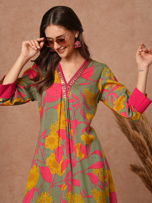 Ethnic Floral Foil Printed & Embroidered Straight...