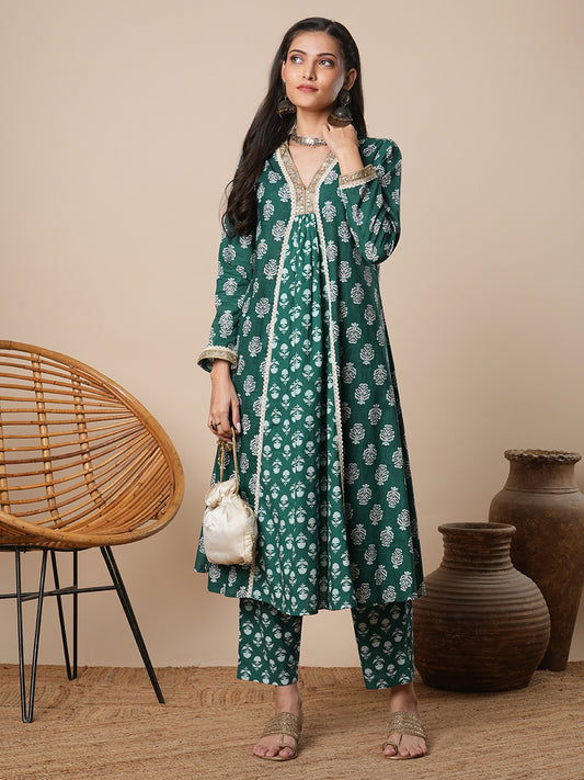 Geometric Printed Anarkali Flared Kurta with Pant...