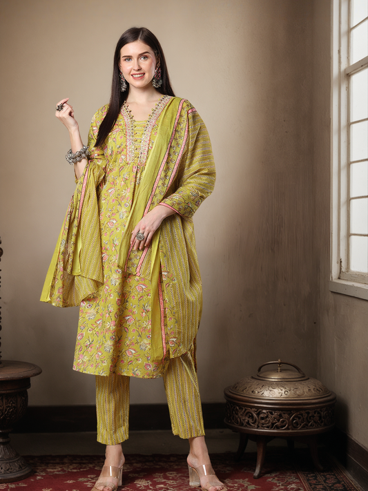 Ethnic Floral Printed & Embroidered Straight Fit...